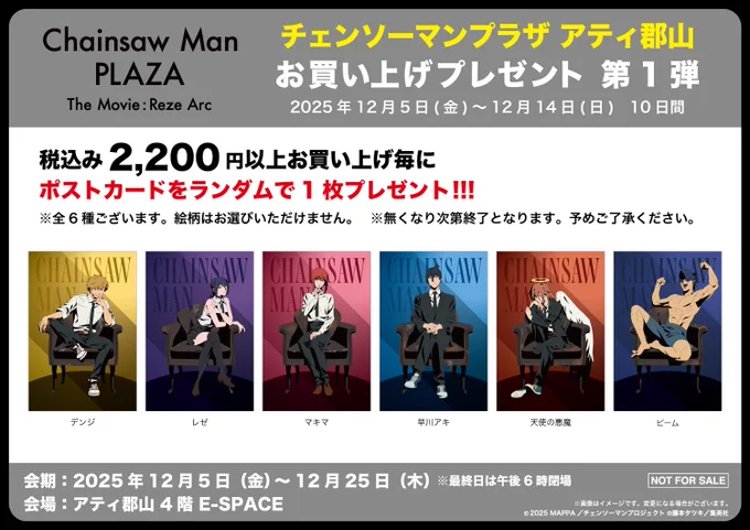 アティ郡山 『CHAINSAWMAN PLAZA TheMovie:RezeArc』 お買い上げプレゼント第1弾のポストカードですが、数に限りがございますので無くなり次第終了となります。 お早めのご来場お待ちしております。 #チェンソーマン #チェンソーマンプラザ #劇場版チェンソーマンレゼ編 #アティ郡山