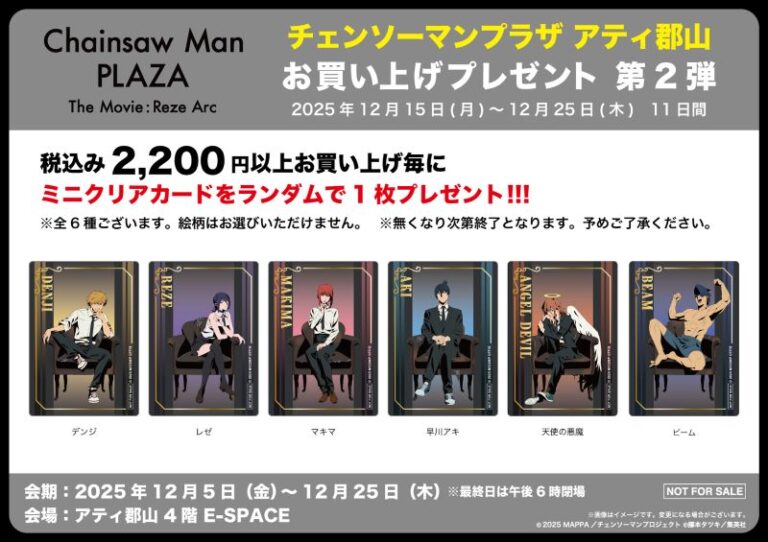 本日よりお買上プレゼント第2弾の配布が開始となります! 劇場版チェンソーマン レゼ編 POP UP SHOP 『CHAINSAW MAN PLAZA TheMovie:RezeArc』 開催期間 12/5(金)〜12/25(木) 開催場所 アティ郡山4階 E-SPACE 営業時間 10:00〜20:00 ※最終日は18時閉場