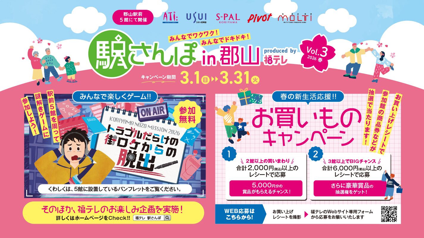 本日もたくさんのご来場ありがとうございます。 明日2/23(月祝)催事最終日となります。 混雑が予想されるのでお時間に余裕をもってご来館くださいませ。 #アティ郡山