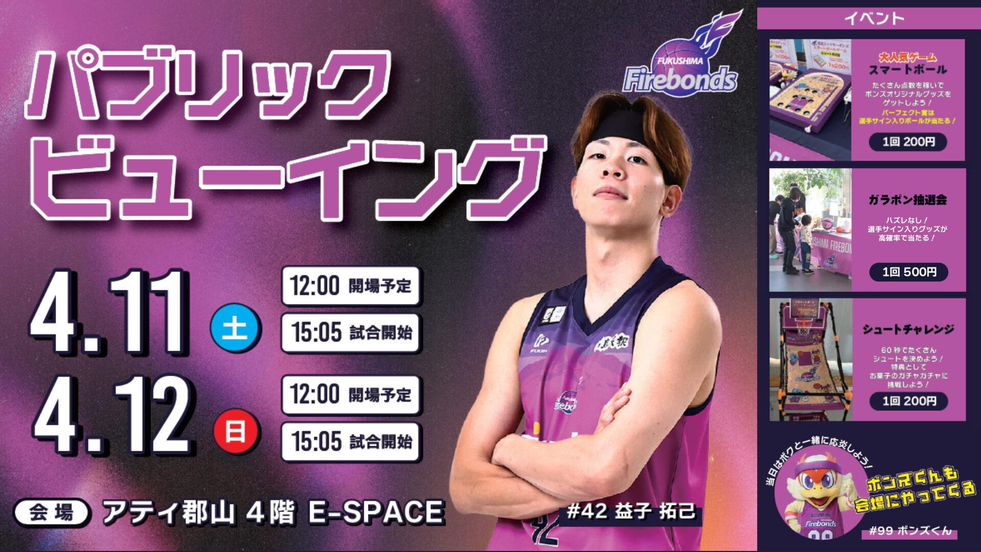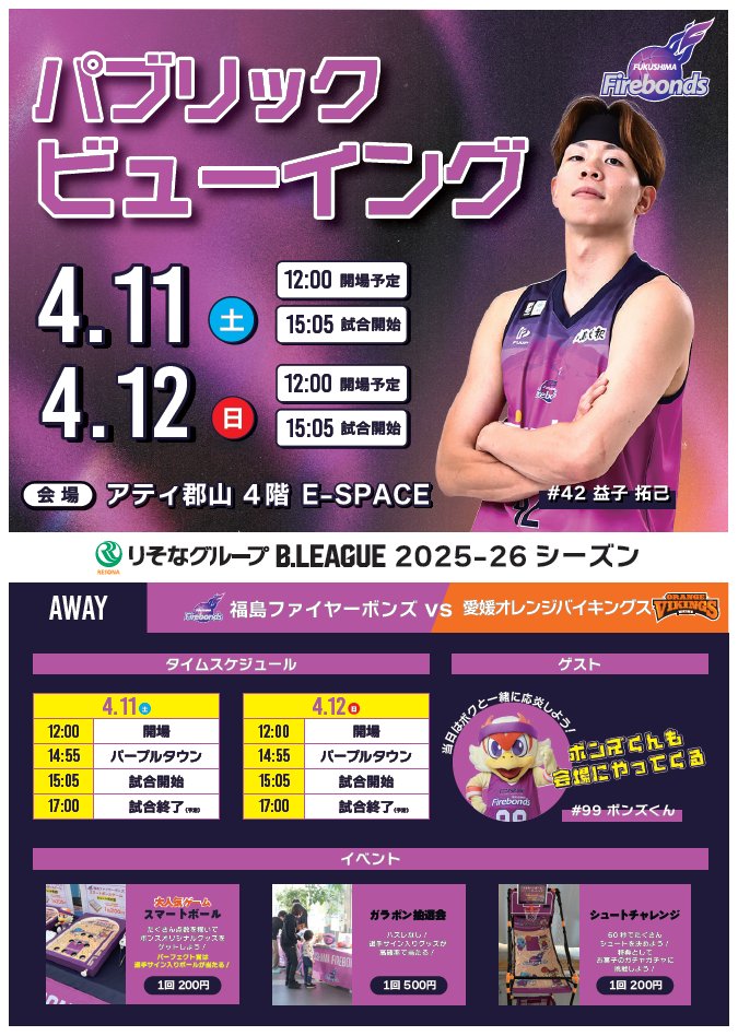\ボンズくんもやってくる!/ 4/11(土)、4/12(日) #福島ファイヤーボンズ パブリックビューイングイベント #アティ郡山 4階E-SPACEにて開催! 会場ではサイン入りグッズなどが当たる 体験型イベントも開催します! アティ郡山で一緒に #ファイヤーボンズ を応炎しよう!