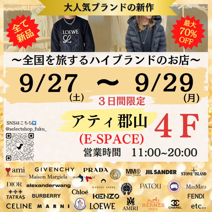 \Selectshop Fuku ポップアップ/ 本日より3日間開催! まもなくOPENです! アティ郡山4階 E-SPACE 9/27(土)〜9/29(月) 営業時間 11:00〜20:00 全国各地で最新のトレンドアイテムから 人気のアイテムなど 海外ハイブランドの新作定番商品をメインに 1500点以上の商品を割引価格で販売致します!
