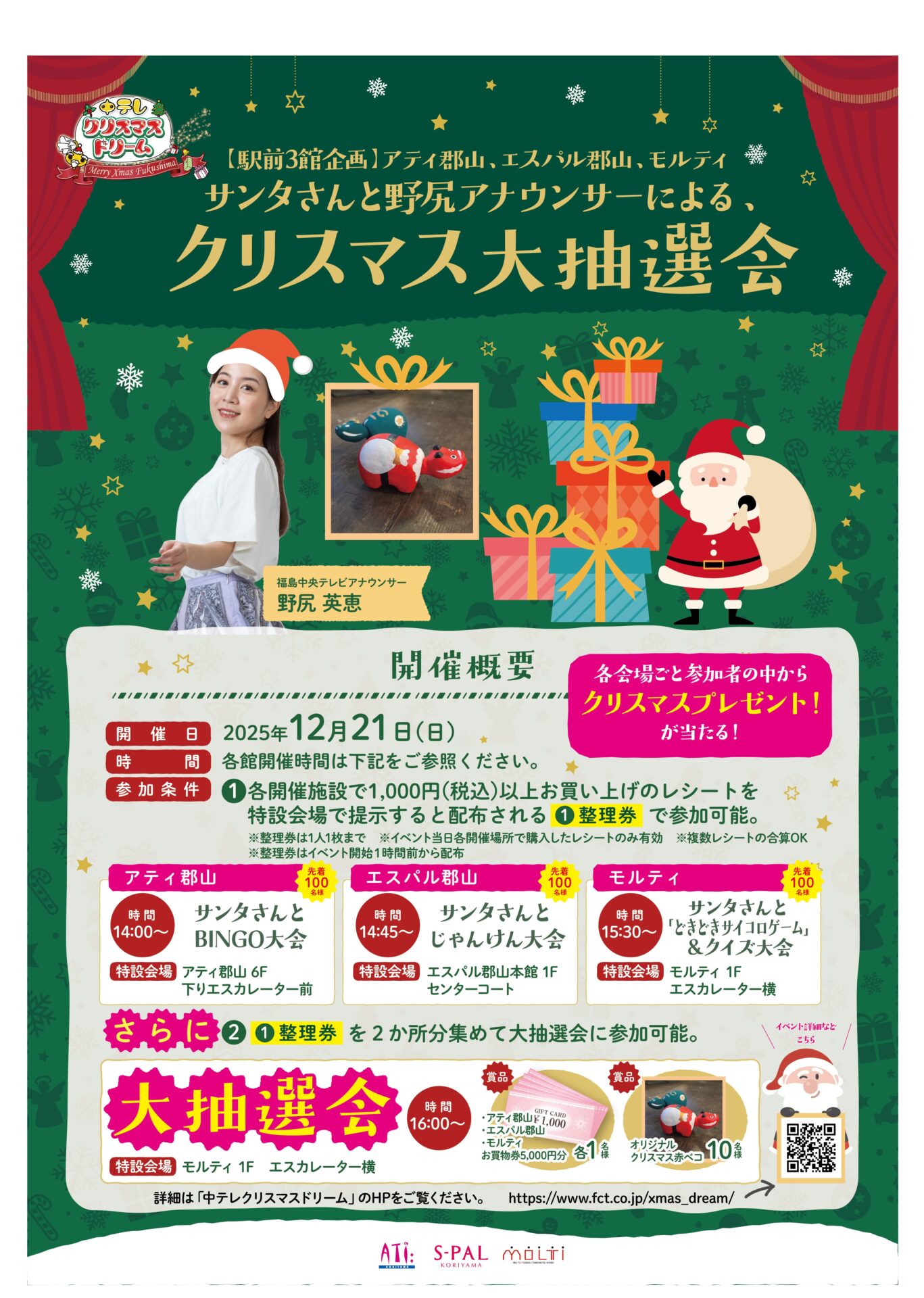 中テレクリスマスドリームの一環として、アティ郡山では、サンタさんと野尻アナウンサー(福島中央テレビ)による「サンタさんとBINGO大会」を開催いたします。