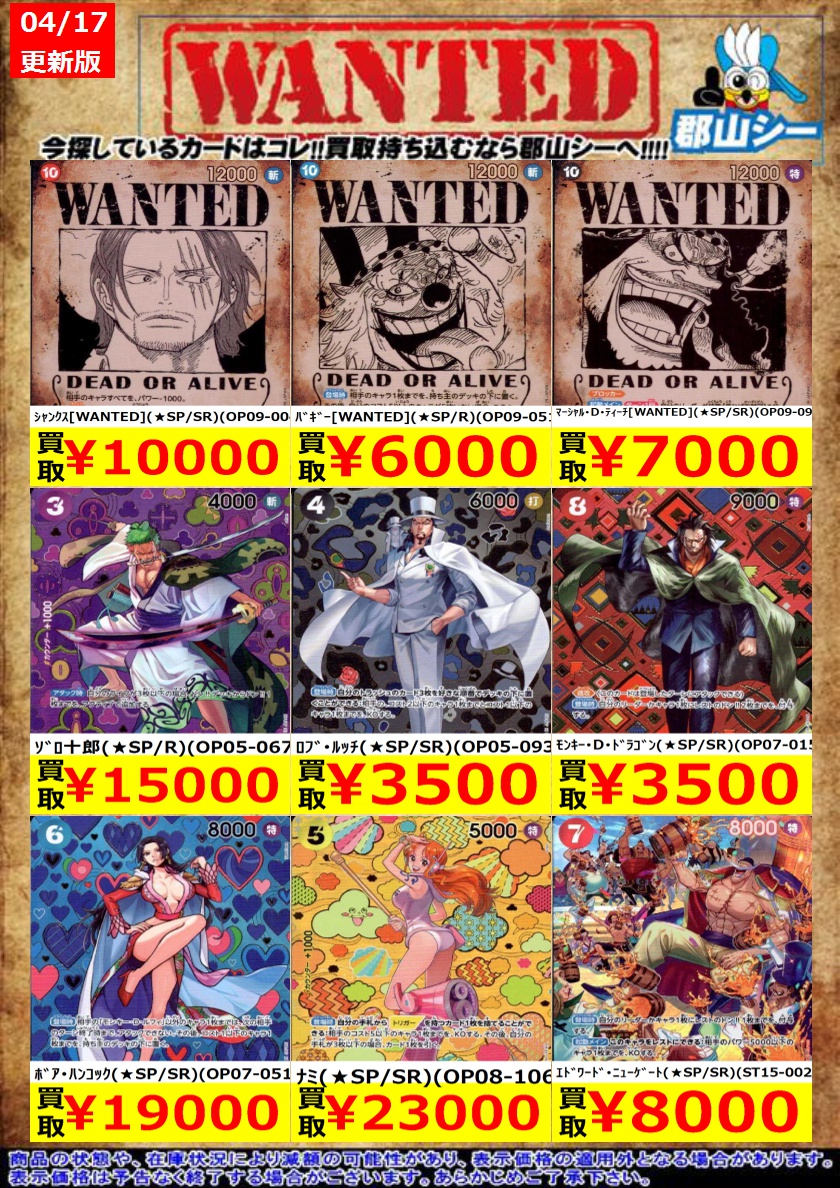【ワンピースカード買取情報】 現在買取強化中の汎用カード一覧です💡 在庫足りておりませんのでぜひお持ち込みください🙇♀️ カードラボ郡山店までご来店お待ちしております❗️