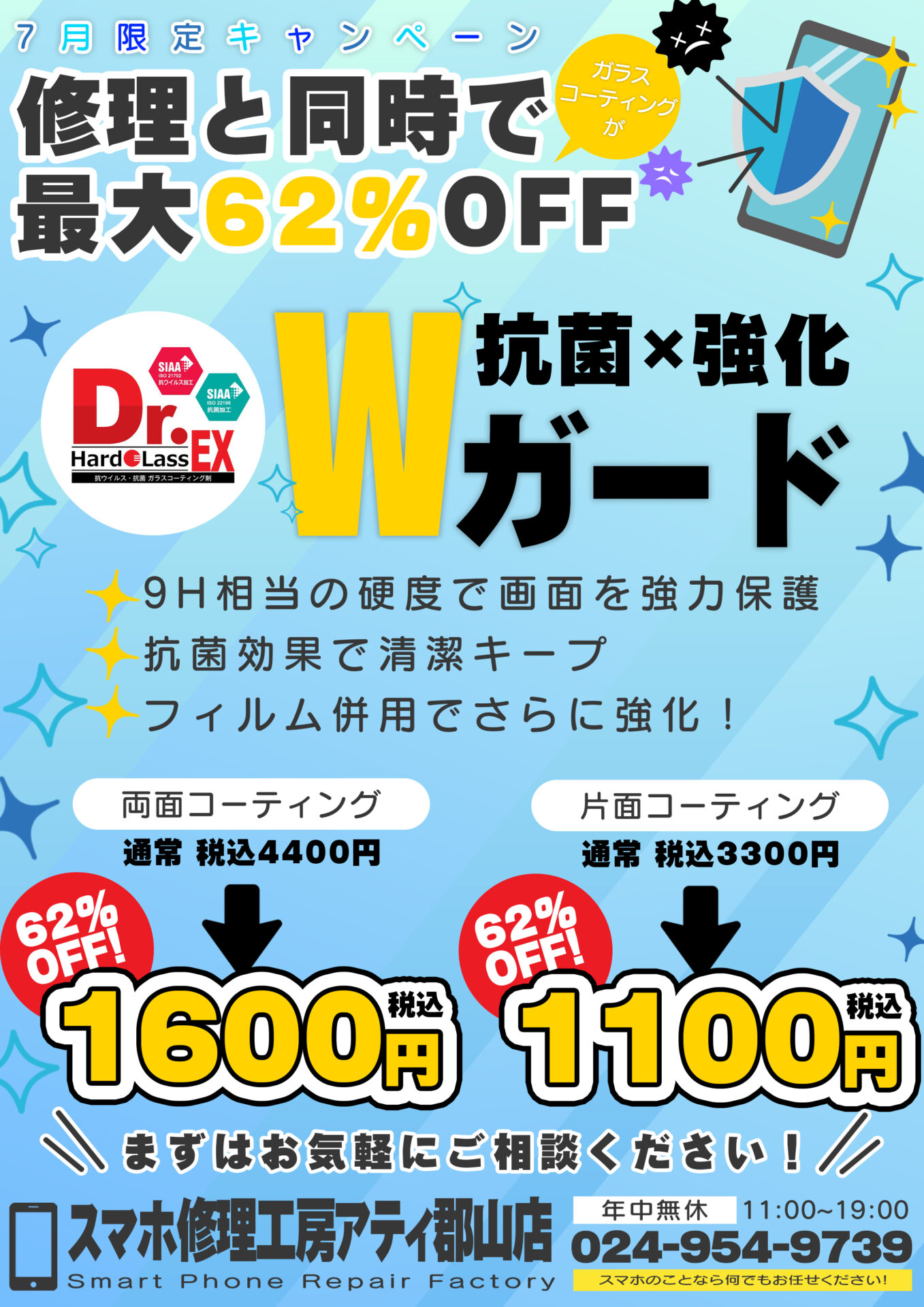 2025.07.03 スマホ修理工房 ガラスコーティング62%offの大特価キャンペーン‼️ 7月1日~7月31日 ガラスコーティング62%offの大特価キャンペーン‼️ スマホ・タブレット・Switch・Applewatchなどの画面(フロントパネル)の コーティングがなんと修理同時で62%offの大特価キャンペーン行います‼️ ガラスコーティングは9H相当の強度になり画面が割れにくくなります! さらに抗菌作用もあり、衛生面でも活躍します! スマホは落としやすいですからこの機会にコーティングしちゃいましょう📱✨ ショップ名 スマホ修理工房 業種 スマホ修理 ショップページ https://www.ati-koriyama.net/floor-guide/sumahosyuurikoubou/