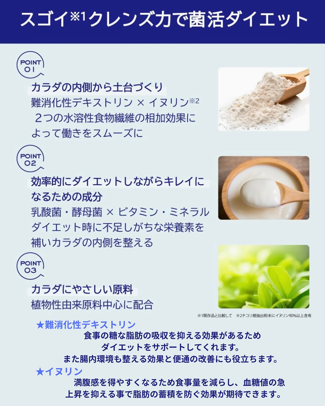 乳酸菌・酵母菌×ビタミン・ミネラルをダイエットの時に不足がちな栄養素を補いカラダの内側から整えます。