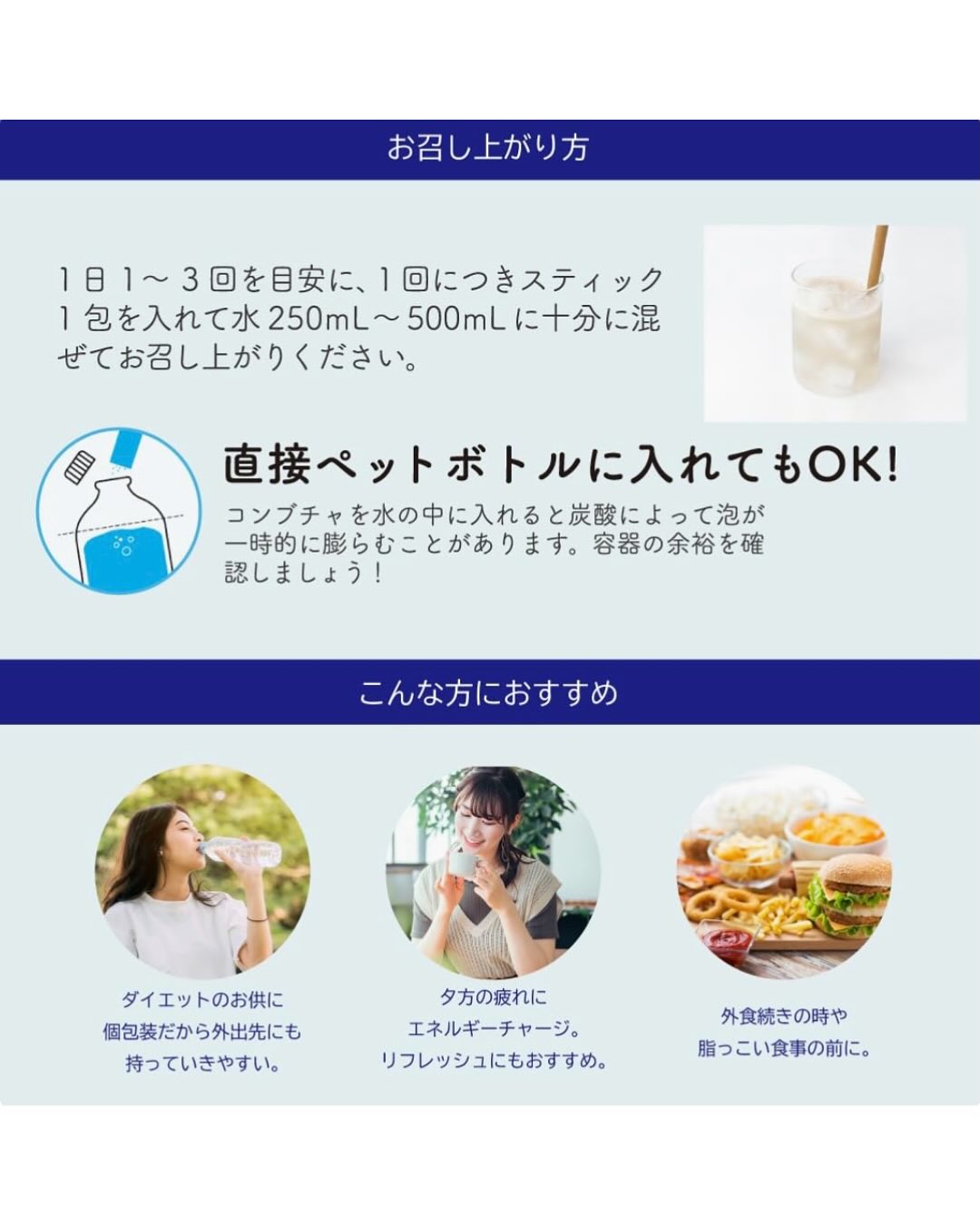 コンブチャには、脂肪の蓄積を減らす効果や、代謝を上げる効果、腸内環境を整える効果があり、痩せやすい体を作る成分も配合されているのでダイエットをサポートしてくれます🥳