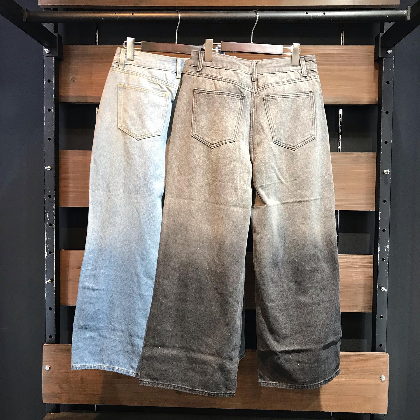 膝のあたりから裾に向かって徐々に色が濃くなるグラデーションデザインが特徴的なワイドデニムとなっております。