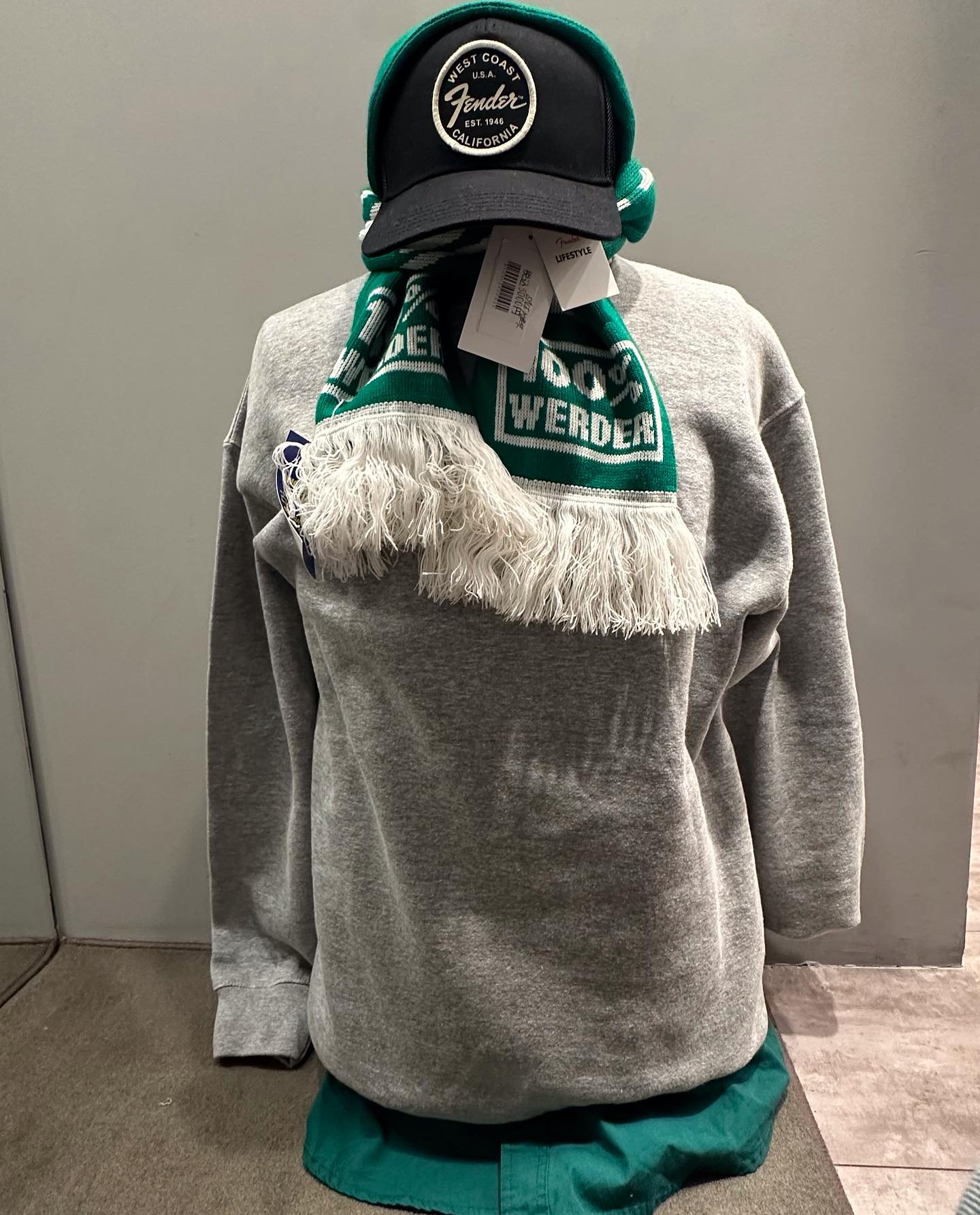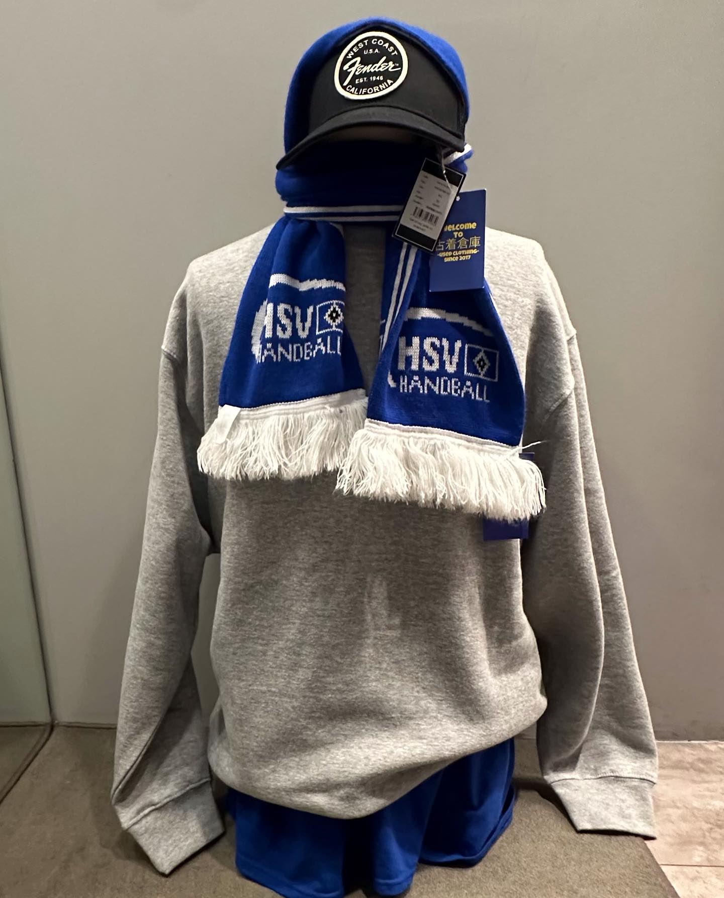 サッカーマフラーとプロクラブの無地スウェットを使ったコーデです