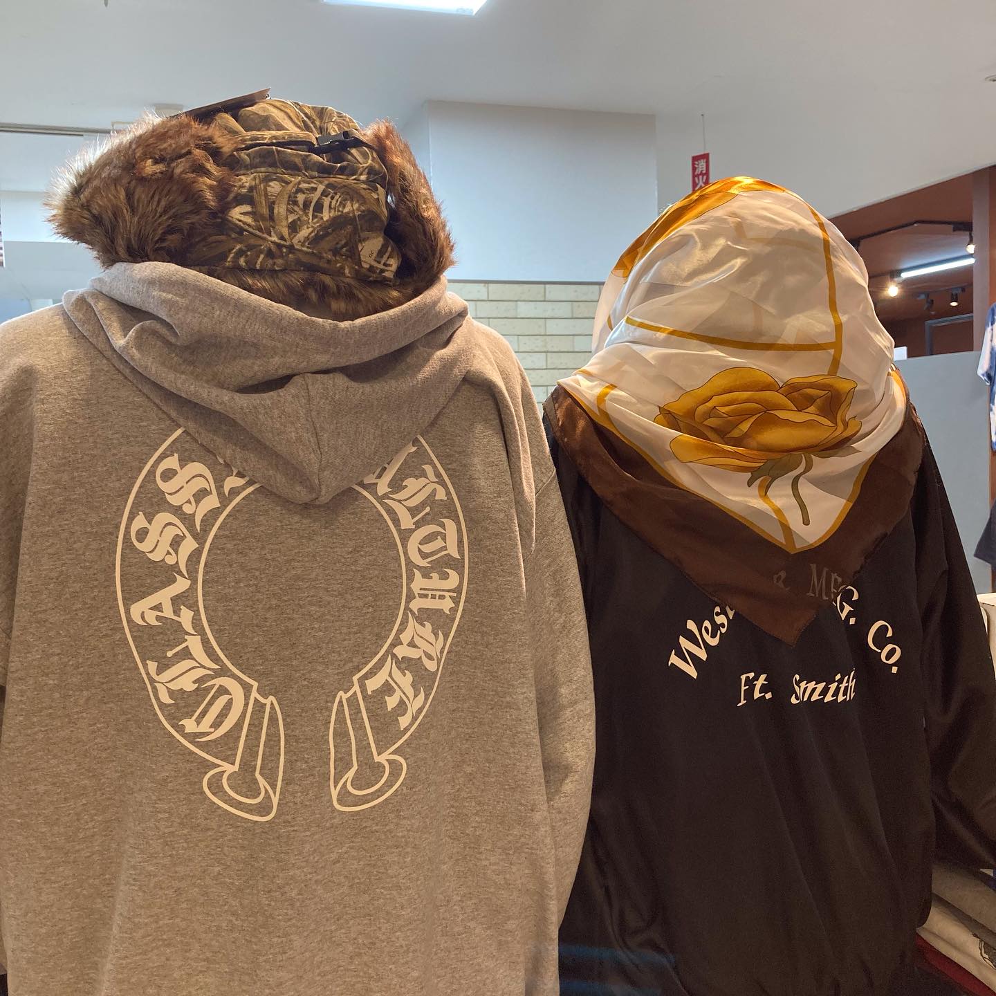 右側のmen's clothingは中にシャツを、アウターにNEWアイテムのZIPパーカーを羽織りました