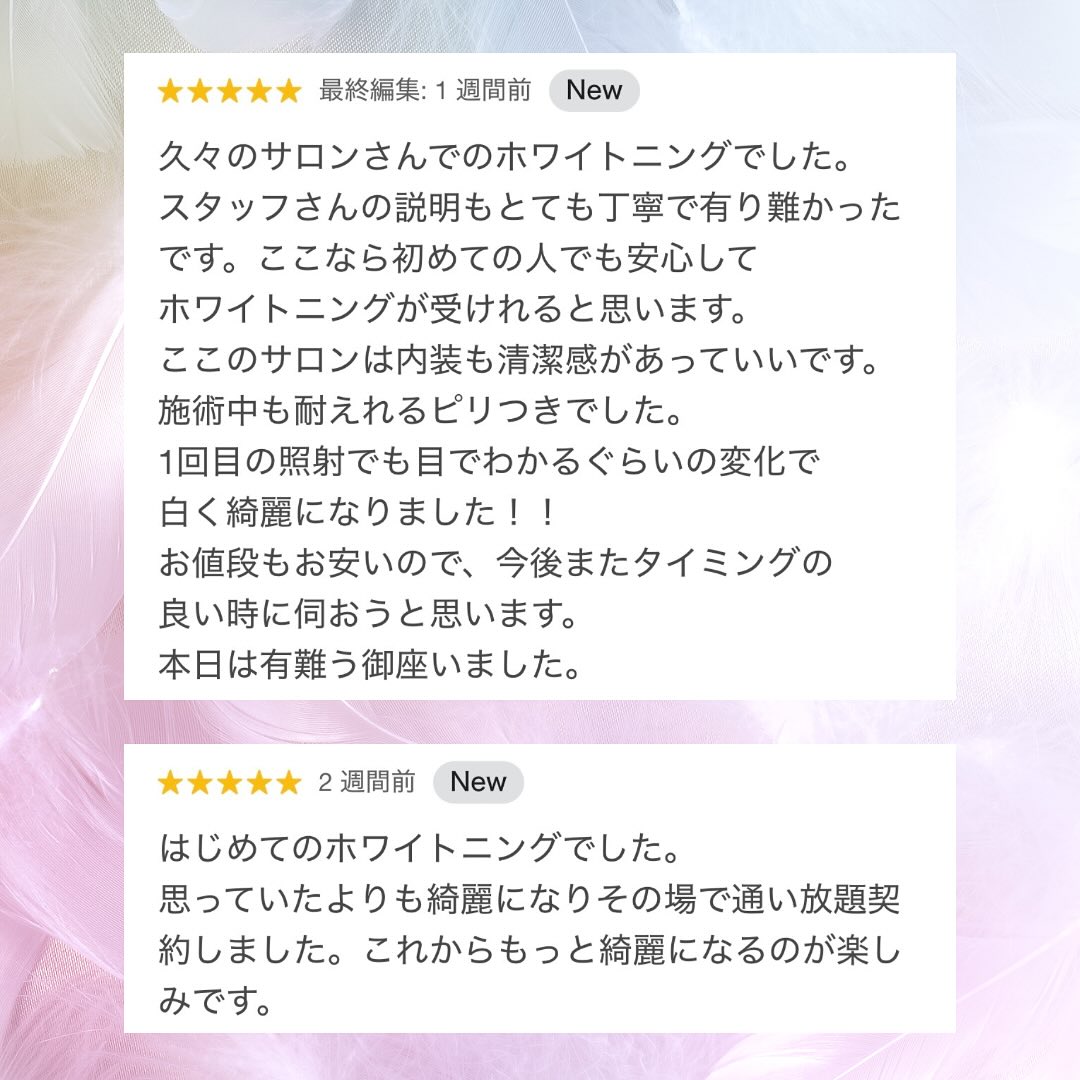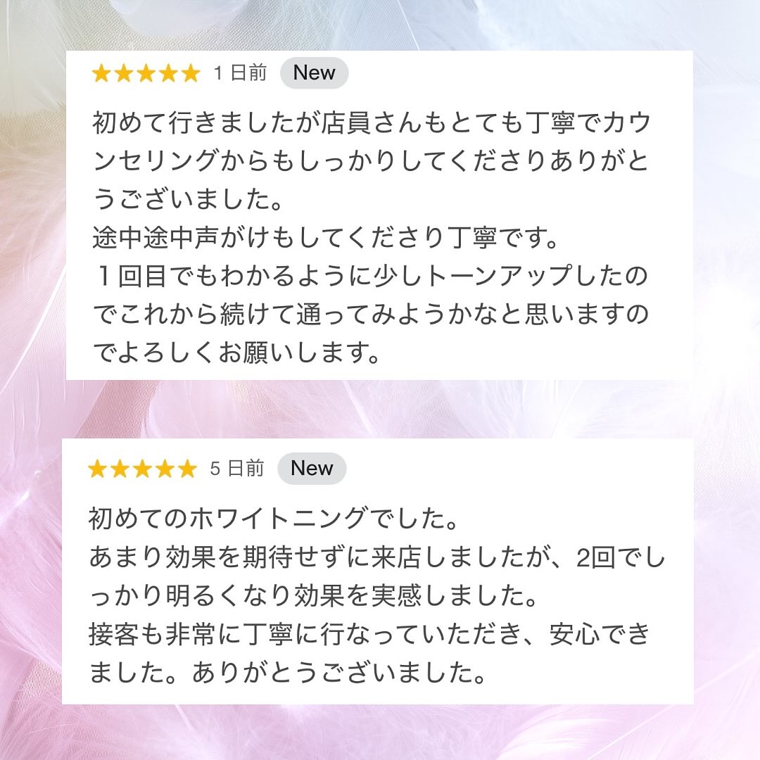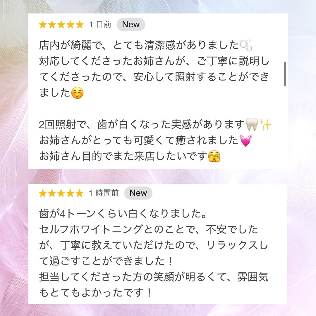 ︎ 【お客様の声をご紹介】 いつもホワイトニングバーアティ郡山店をご利用いただき、誠にありがとうございます🦷 おかげさまで、日々たくさんの嬉しいお声をいただいております。 「効果がしっかり感じられた」「丁寧で安心できた」「通うのが楽しみ!」など、 ひとつひとつのクチコミが、私たちスタッフの原動力になっています️︎︎ はじめてのホワイトニングは緊張する方も多いですが 当店では初回のカウンセリングから 施術の流れまでしっかりサポートいたします 「白い歯」は清潔感や好印象につながる大切なポイント。 そんなお手伝いができること、スタッフ一同とても嬉しく思います^>𐋣<^ これからも、お客様一人ひとりのお悩みに寄り添いながら、理想の口元づくりをサポートしてまいります🪥 ホワイトニングバー アティ郡山店 アティ郡山 6F にて、皆さまのご来店を心よりお待ちしております #ホワイトニングバーアティ郡山店 #郡山ホワイトニング #お客様の声 #口コミ紹介 #セルフホワイトニング #第一印象は口元から #清潔感アップ #白い歯で笑顔に #歯のトーンアップ #美容習慣 #歯を大切に #福島県郡山市