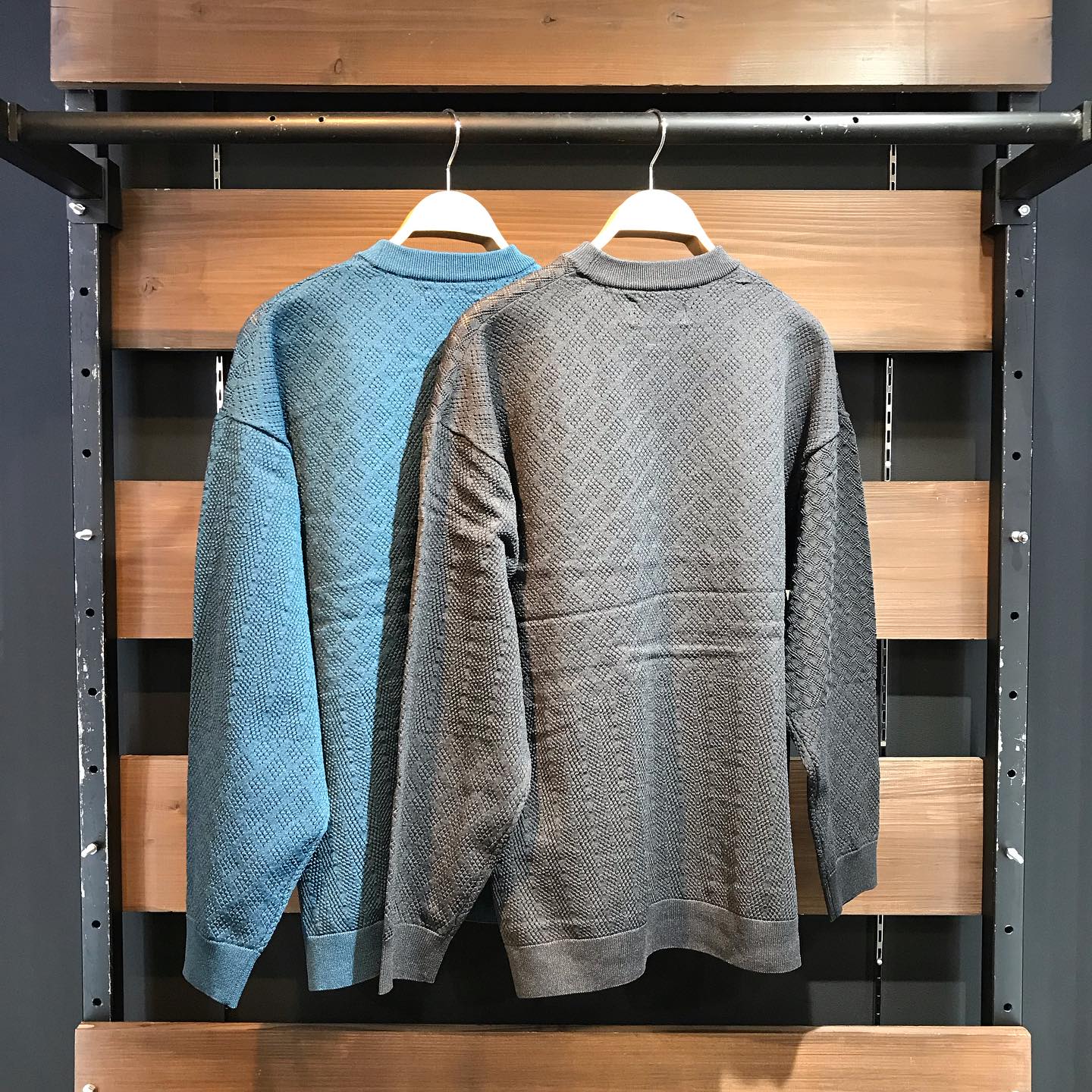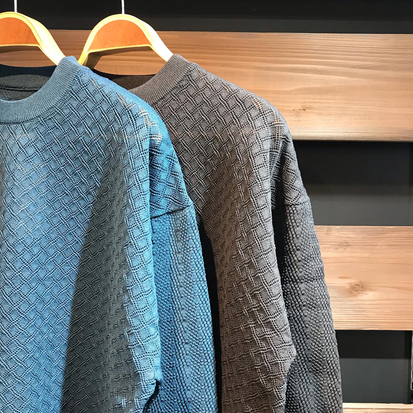 スポンジのように軽く、ふわっとした風合いの糸で編み立てたニットで、透かし編みで透け感と凸凹感を表現し、さらに前後左右で柄が違うのもポイント。
