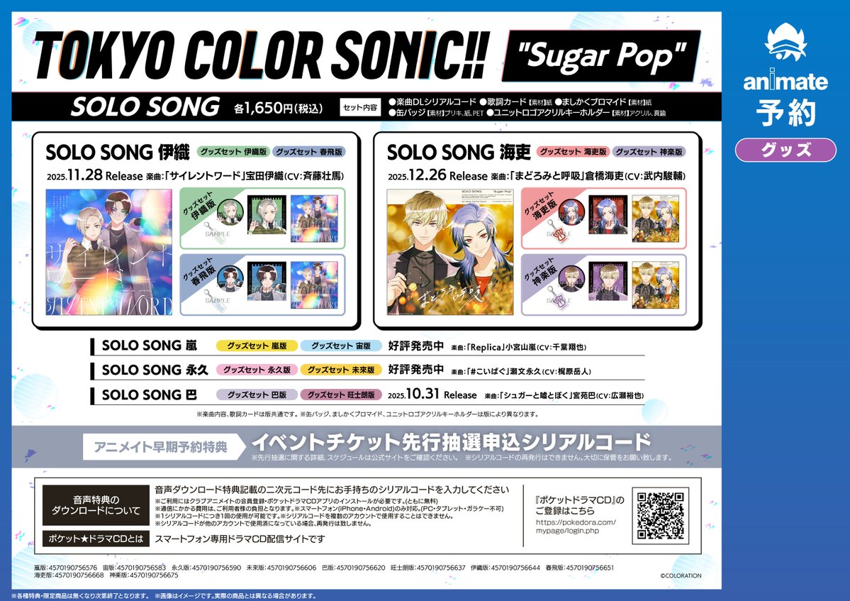 【グッズ予約情報】 東京カラーソニック!! ・”Sugar Pop” SOLO SONG 海吏 【グッズセット海吏版】、【グッズセット神楽版】 ・”Sugar Pop” UNIT SONG 嵐&永久&巴 グッズセット 各種予約受付中コォ✨✨ 早期予約特典シリアルコードお渡しは11/30までですコォ‼️