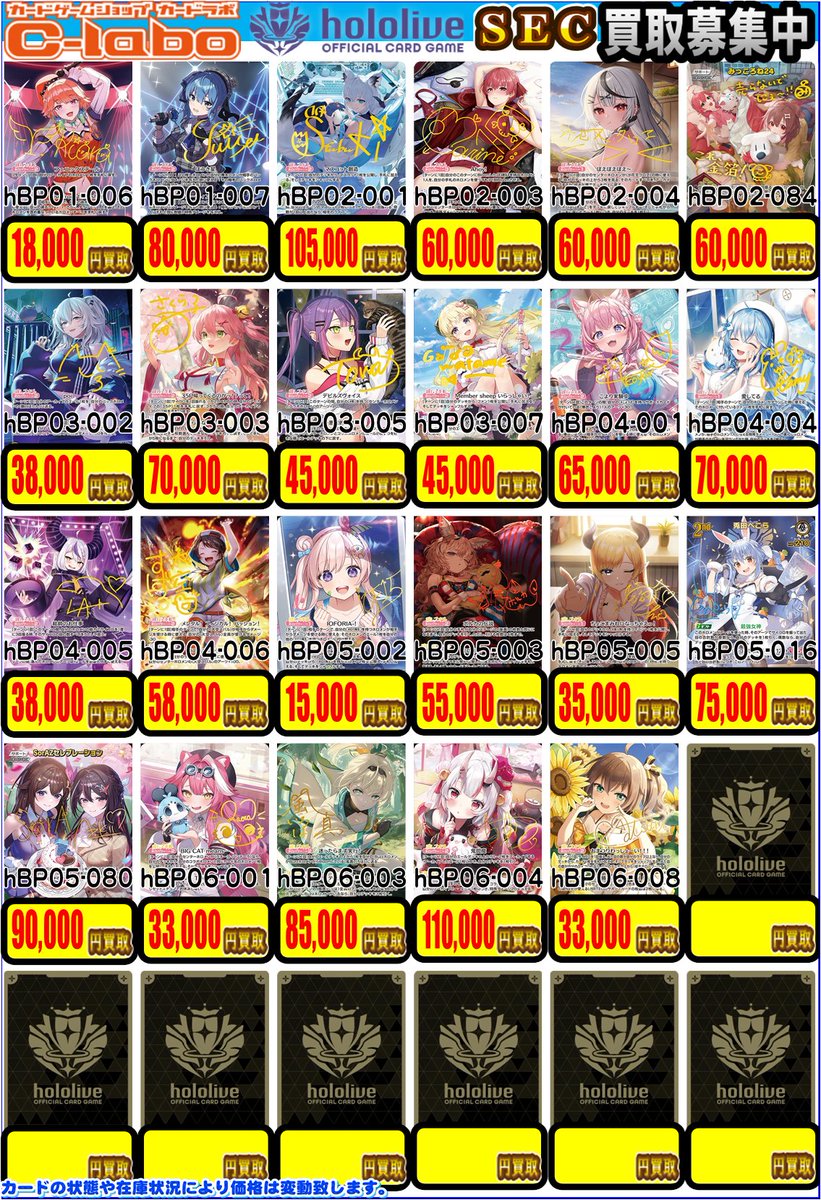 【ホロカ買取情報】 宝鐘マリン【SEC】hBP02-003 ¥60000買取 兎田ぺこら【SEC】hBP05-016 ¥75000買取 百鬼あやめ【SEC】hBP06-004 ¥110000買取 SEC、OUR、UR買取募集中です🎀 ホロカ買取はカードラボ郡山店まで💖 たくさんのお持ち込みお待ちしております🙇♂️