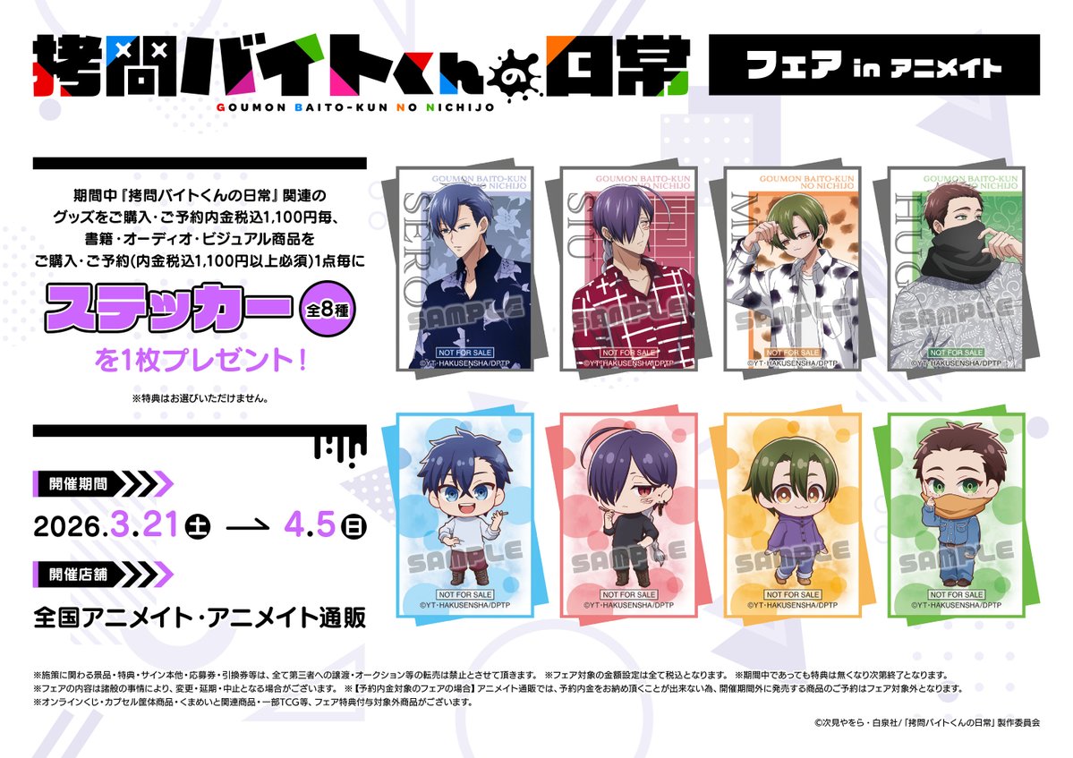 【フェア情報】 🎊3月21日より開催決定ですコォ🎊 TVアニメ「拷問バイトくんの日常」フェア in アニメイト 期間中、フェア条件を満たしたお客様に、≪ステッカー(全8種)≫を1枚プレゼント🎁✨ #拷問バイトくんの日常 🔻詳細はこちら🔻