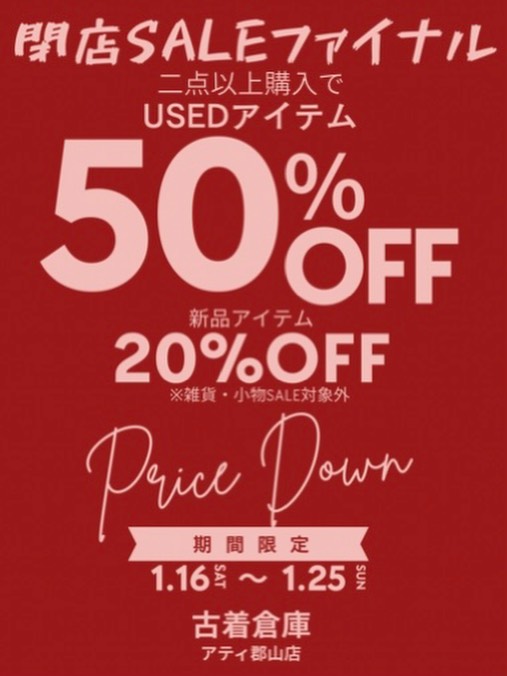 -古着倉庫Ati郡山店- ︎new sale 閉店 SALEファイナル 明日からはなんと、最大50%OFF️ #古着 #古着屋 #福島古着屋 #郡山古着屋 #古着倉庫米沢 古着倉庫 郡山駅前 郡山 郡山市 いわき 白河市 須賀川市 いわき市 二本松市 新潟 会津若松