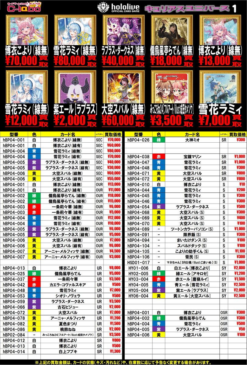 【ホロカ 買取情報】 ✨本日更新✨ 白エール[白上フブキ]SY¥2,800 緑エール[大神ミオ]SY¥2,000 博衣こよりUR¥8,000 儒烏風亭らでんUR¥5,000 などなど!!! 是非お持ち込みお待ちしております!
