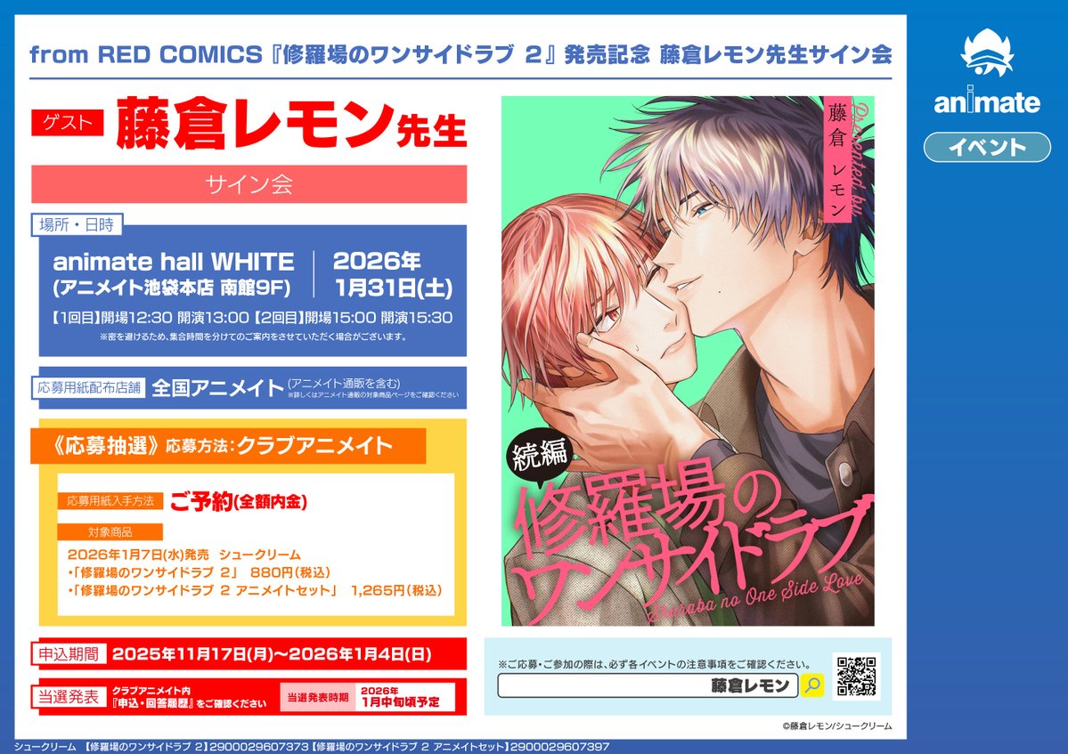 【イベント情報】 from RED COMICS 『修羅場のワンサイドラブ 2』発売記念 藤倉レモン先生サイン会 開催決定コォ‼️‼️ 期間中、対象商品を全額内金ご予約いただいたお客様にシリアル応募用紙をお渡しいたしますコォ✨✨ #藤倉レモン 先生 #修羅場のワンサイドラブ 詳細はPOPをチェック