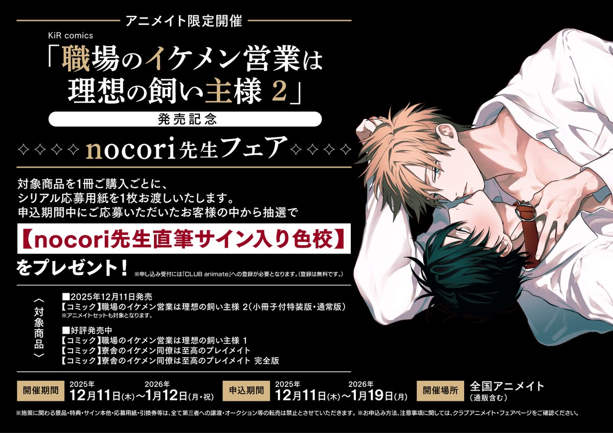 【書籍フェア情報】 間もなく終了‼️ 『KiR comics「職場のイケメン営業は理想の飼い主様 2」発売記念 nocori先生フェア』開催中コォ🎉 期間中、対象商品を1冊ご購入ごとに抽選で 【直筆サイン入り色校】が当たる≪シリアル応募用紙≫を1枚お渡し✨ 🔽詳細はコチラ🔽