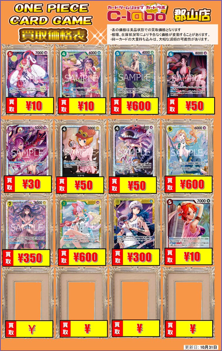 【ワンピースカード買取情報】 ワンピ汎用買取表を作成しました!! 在庫足りておりませんのでぜひお持ち込みください🙇♂️ 明日もご来店お待ちしております!!