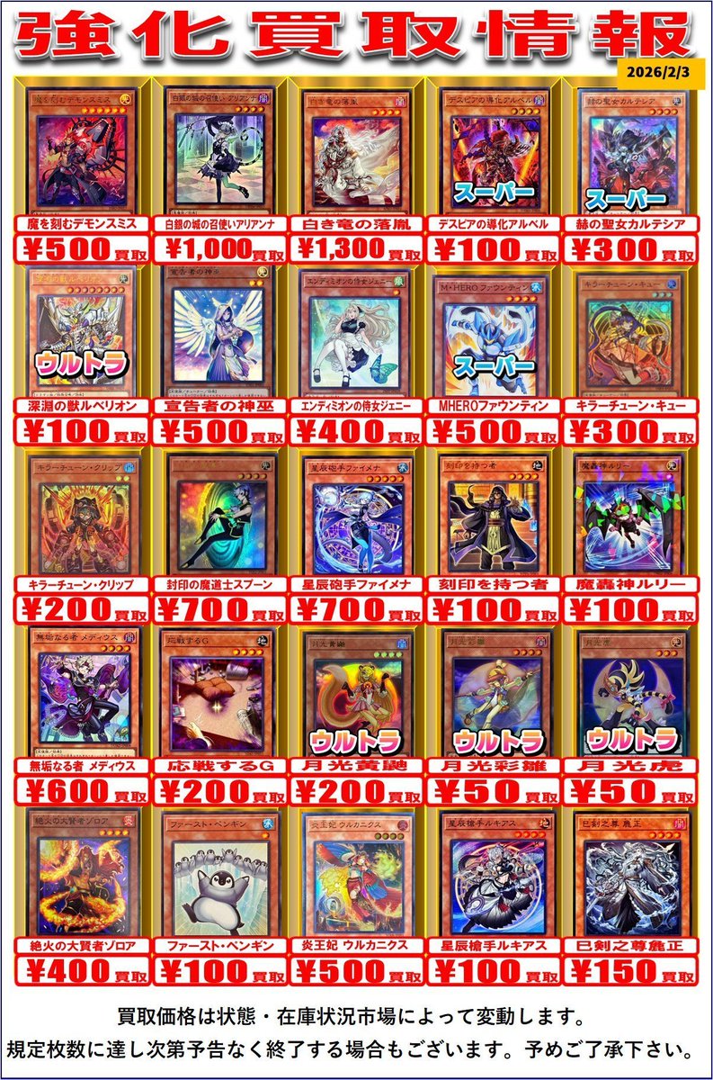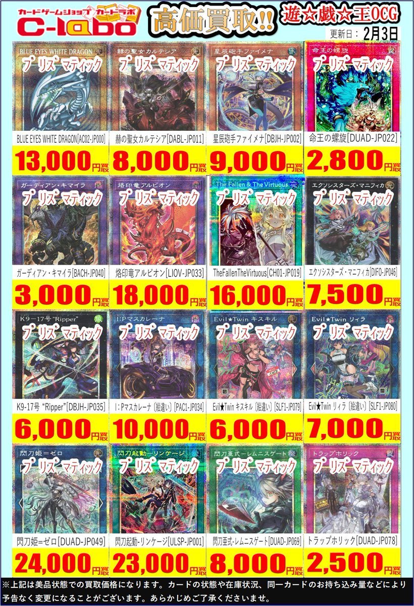 【遊戯王OCG 買取情報】 高レアの買取表になります!! 是非お持ち込みお待ちしております!!
