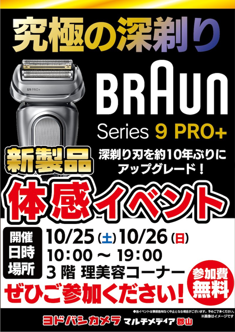 / ブラウンシリーズ9Pro+ 体験会開催‼️ \ 深剃り刃を搭載した シリーズ9Pro+が新発売🎉 究極の深剃りシェーバーを 実際にご体感いただけます✨ お髭のお手入れにお悩みの方は ぜひご来店ください🎵 🗓10/25(土)10/26(日) 🕙10:00~19:00 📍3階 理美容コーナー 🏬