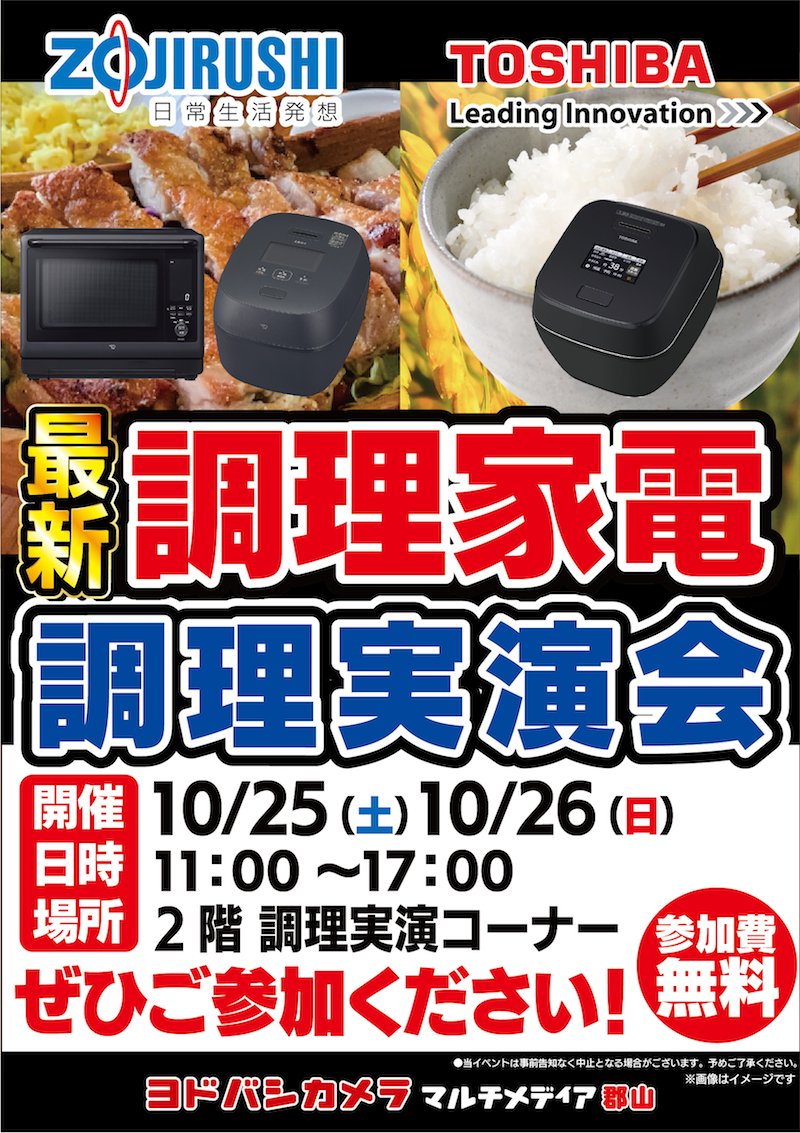 / 象印・東芝調理実演会開催 \ 冷凍した食品をおいしく調理できる 象印最新オーブンレンジ実演会を開催✨ 同時に象印と東芝の最新炊飯器を使った炊き比べも行います❗️ ぜひお越しください💁 🗓10/25(土)~10/26(日) 🕙11:00~17:00 📍2階調理実演コーナー 🏬