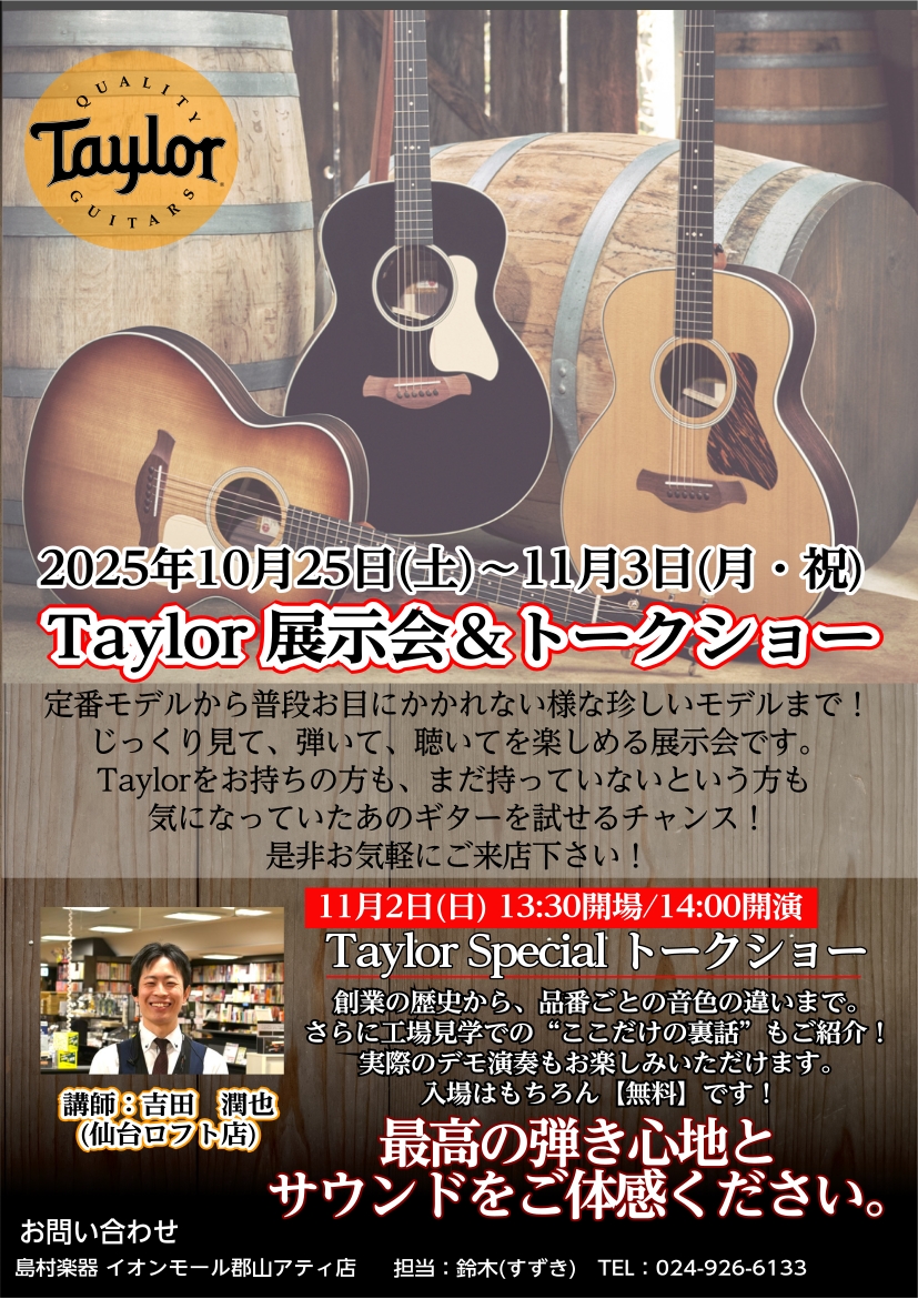 【#イベント 情報】 10/25(日)~11/3(月/祝)の期間 “#Taylor イベントが郡山店で催されます🔊 さらに11/2(日)には 工場訪問の経験もあるスタッフによるトークショーを開催💪 歴史や魅力を、実演を交えながらお伝えします😊 詳細やトークショーの参加ご予約は下記HPより↓