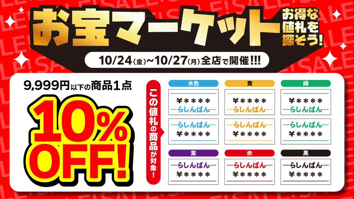 【らしんばん郡山店/キャンペーン情報】 🌟お宝マーケット開催決定🌟 10/24~10/27の期間中、 9⃣,9⃣9⃣9⃣円以下の対象の値札の商品1⃣点が🔟%OFF‼️ お買得なセールをぜひご利用ください☺️