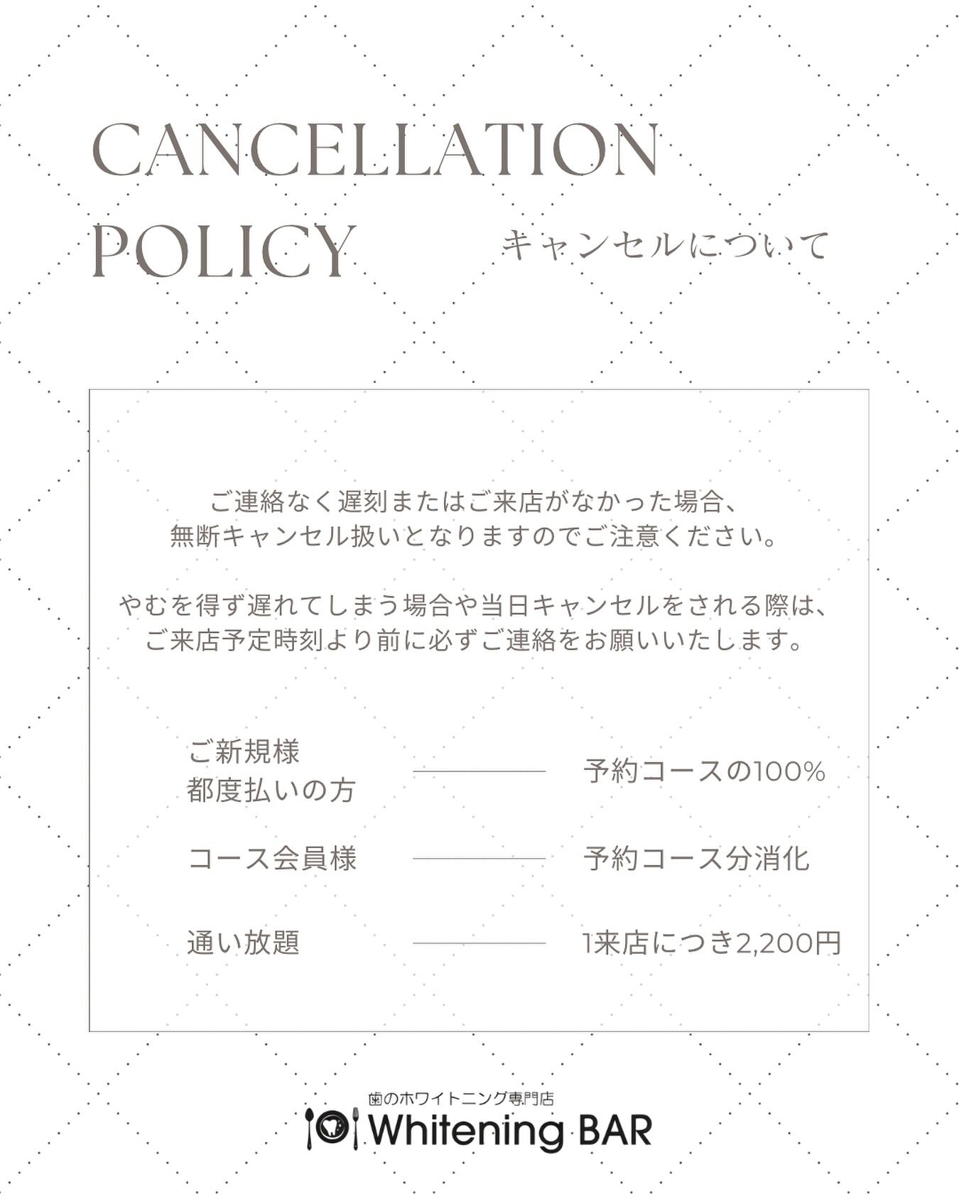︎ いつもWhiteningBARアティ郡山店をご利用いただき誠にありがとうございます 今回は【キャンセルについて】のご案内です。 ご予約時間に遅れてのご来店や、無断キャンセルをされた場合、 キャンセル料またはコース消化となりますのでご注意ください️ ⸻ ご新規様・都度払いの方 ️ 施術料金の100% コース会員様 ️ ご予約分のコース消化 通い放題の方 ️ 1来店につき2,200円 ⸻ やむを得ず遅れてしまう場合や、当日キャンセル・日時変更をされる際は、 ご来店予定時刻より前に必ずご連絡をお願いいたします 皆様が気持ちよくご来店いただけるよう、ご理解・ご協力をお願いいたします🫧 #WhiteningBAR郡山店 #ホワイトニングバー #キャンセルポリシー #ホワイトニング郡山 #セルフホワイトニング #歯の美白ケア #ホワイトニング女子 #ホワイトニング男子 #口元美容 #白い歯は清潔感