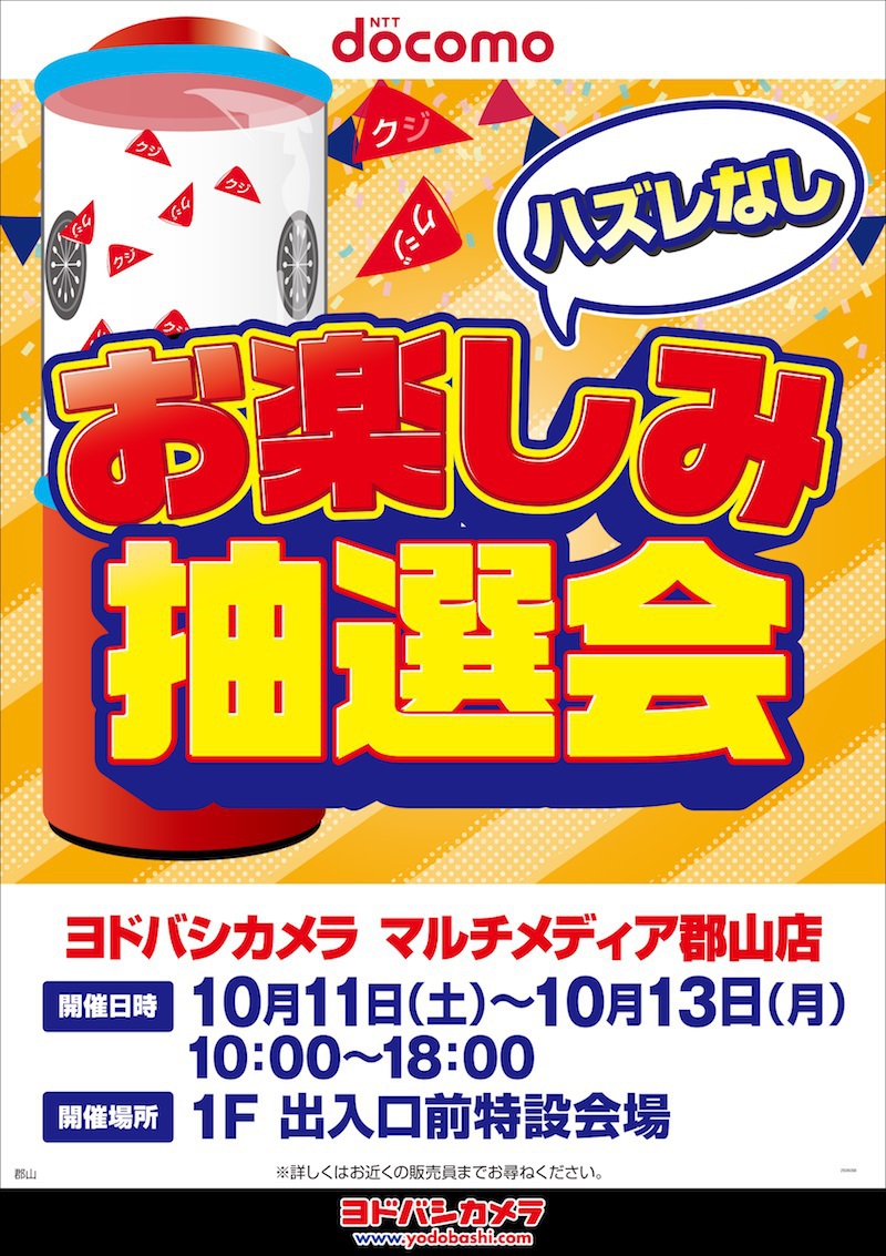 / ドコモ エアーくじ抽選会開催 \ 無料で誰でも参加可能🎶 当店にお立ち寄りの際はぜひ参加してください✨ 🗓10/11(土)~10/13(月・祝) 🕙10:00~18:00 📍1階 出入口前特設会場 🏬