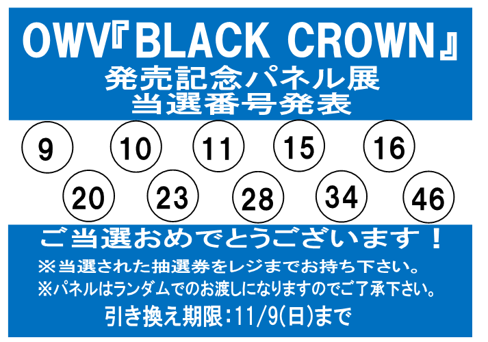 【#OWV】 『#BLACKCROWN』発売記念 パネル抽選プレゼント当選番号発表です🎉 ご当選おめでとうございます😊 ※抽選券をタワーレコード郡山店レジカウンターまでお持ちください。 ※展示品の為汚れや傷がある場合があります。 ※店頭受取のみ。配送はできません。