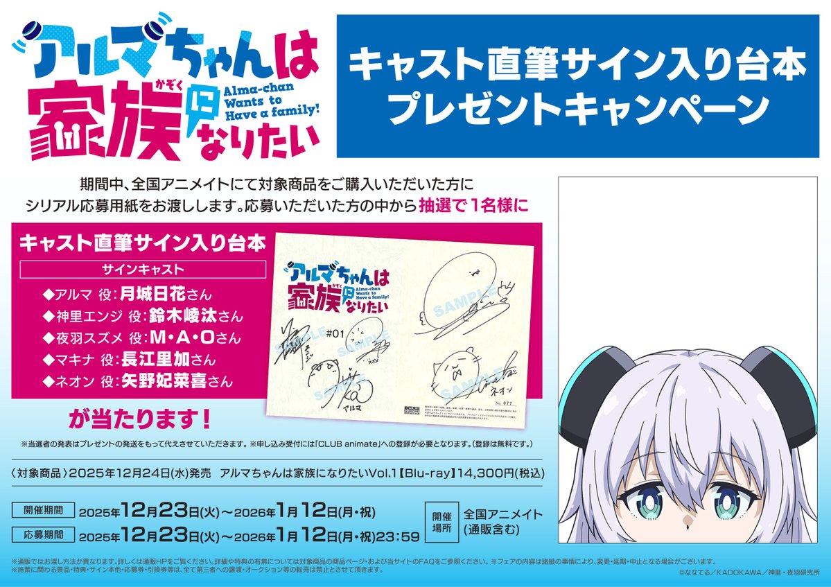 【フェア情報】 TVアニメ「#アルマちゃんは家族になりたい」キャスト直筆サイン入り台本プレゼントキャンペーン 12/23より開催決定コォ‼️‼️ 期間中、対象商品をご購入いただいた方にシリアル応募用紙をお渡ししますコォ✨✨ 詳細は🔽POPをチェック