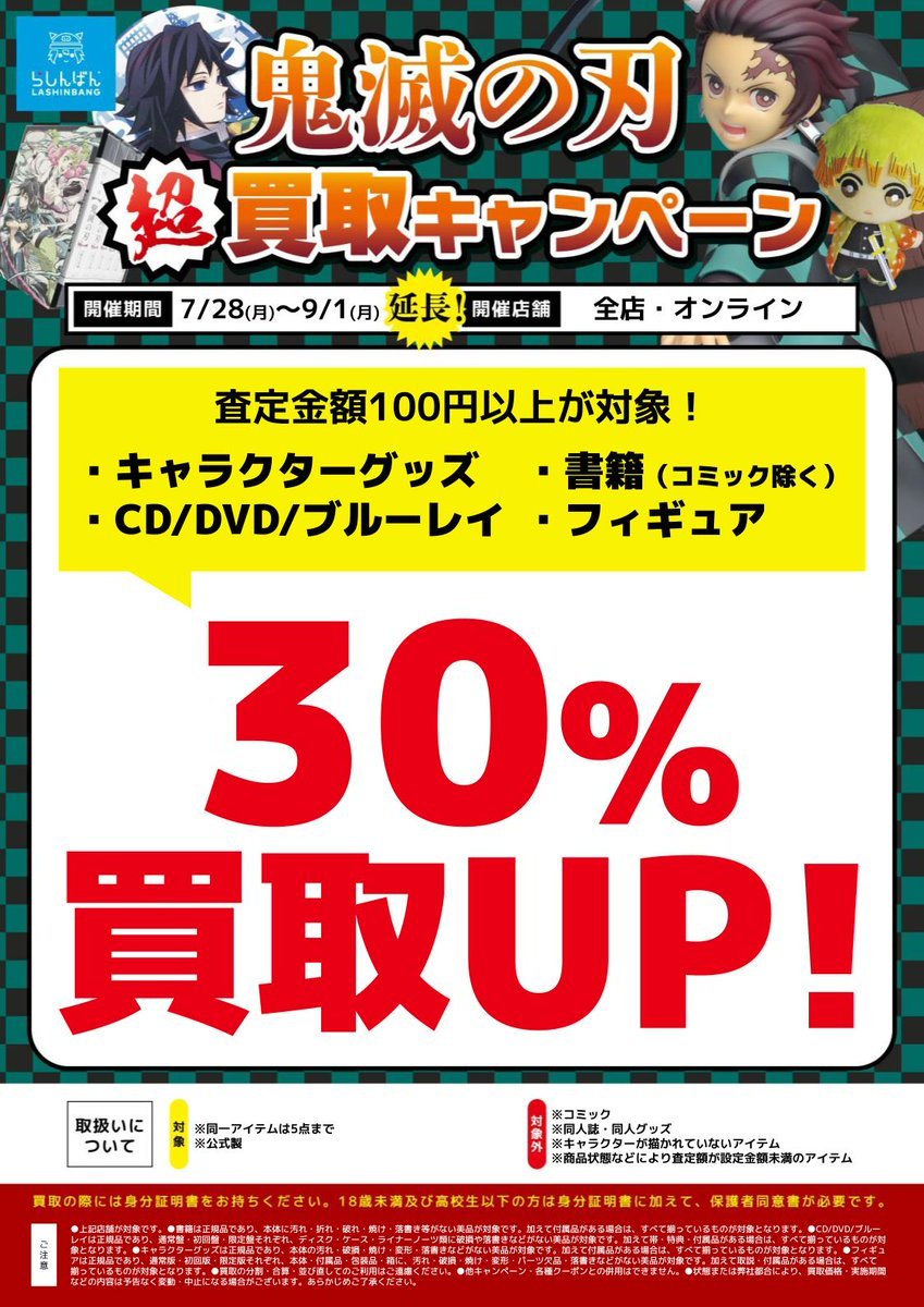 おはようございます! らしんばん郡山店、本日も営業開始🌟 販売は夜20時、買取は12時~18時です! #鬼滅の刃 超買取キャンペーン開催中‼️ 査定金額が1⃣0⃣0⃣円以上の キャラクターグッズ・書籍(コミック除く)・ CD/DVD/ブルーレイ・フィギュアの金額が3⃣0⃣%UP‼️ お持ち込みお待ちしております🙌
