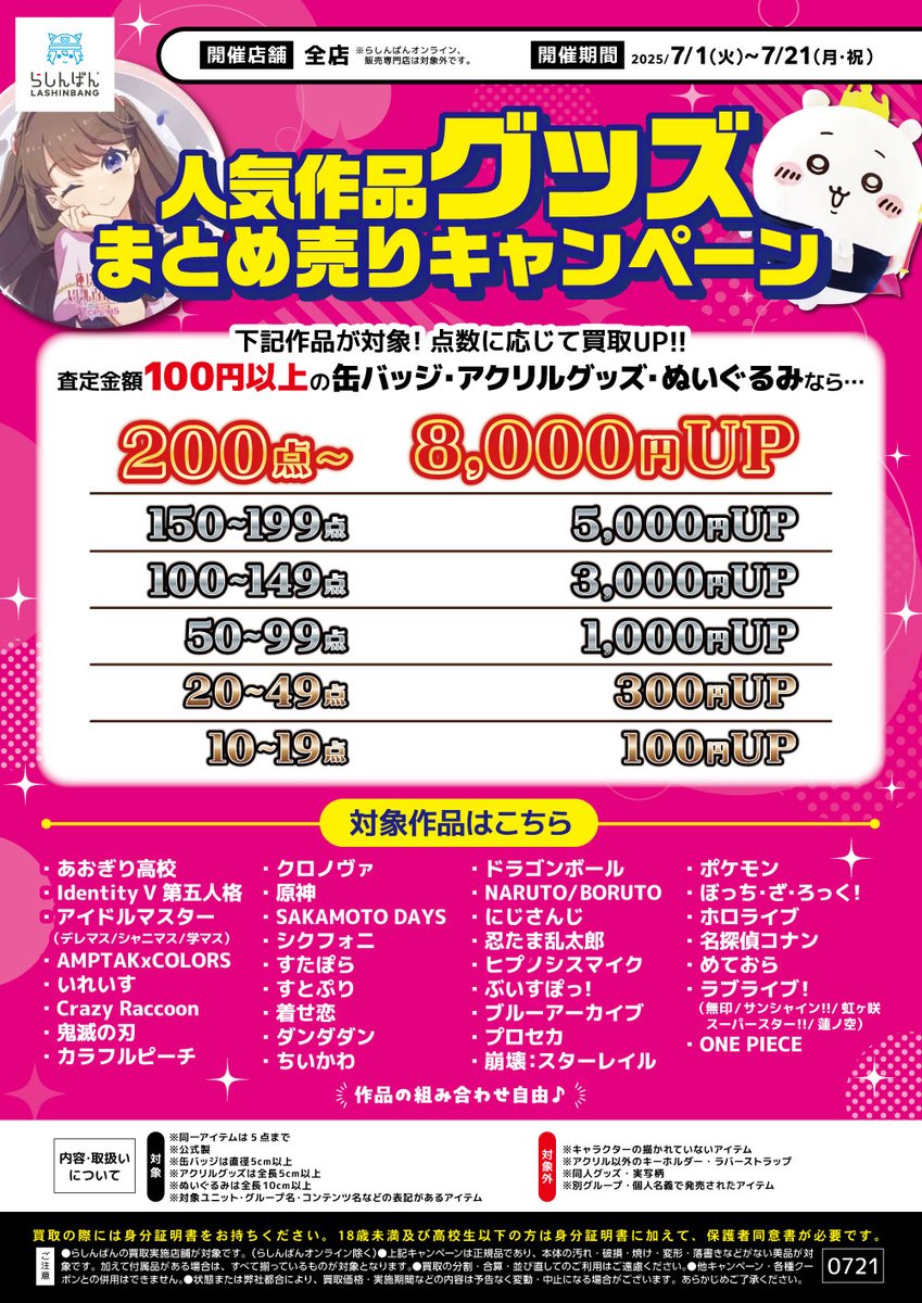 【らしんばん郡山店/キャンペーン情報】 ✨人気作品グッズまとめ売りキャンペーン✨ 7/1~7/21の期間中、 査定金額1⃣0⃣0⃣円以上の 対象作品の缶バッジ・アクリルグッズ・ぬいぐるみをお持ち込みで買取金額が🆙 詳しくはコチラをご確認ください👇 lashinbang.com/news/9681/