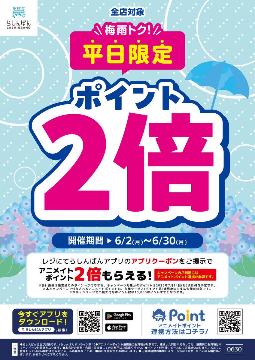 【らしんばん郡山店/キャンペーン情報】 ☔平日限定☔ポイント2⃣倍‼️ 6月の平日限定で レジにてクーポンをご提示いただくとアニメイトポイントが2⃣倍もらえます😍 この機会に是非、アプリのご登録をお願いいたします🙇