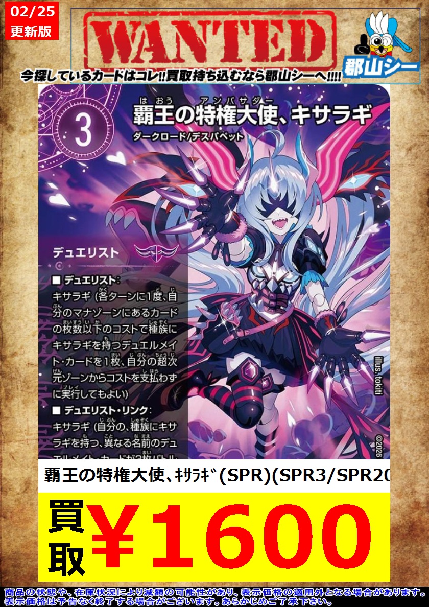 シーガル郡山店デュエマお買取り情報!! ※商品の状態や在庫状況により減額の可能性があり、表示価格の適用外となる場合がございます。 覇王の特権大使、キサラギ(SPR)(SPR3/SPR20) ¥1,600