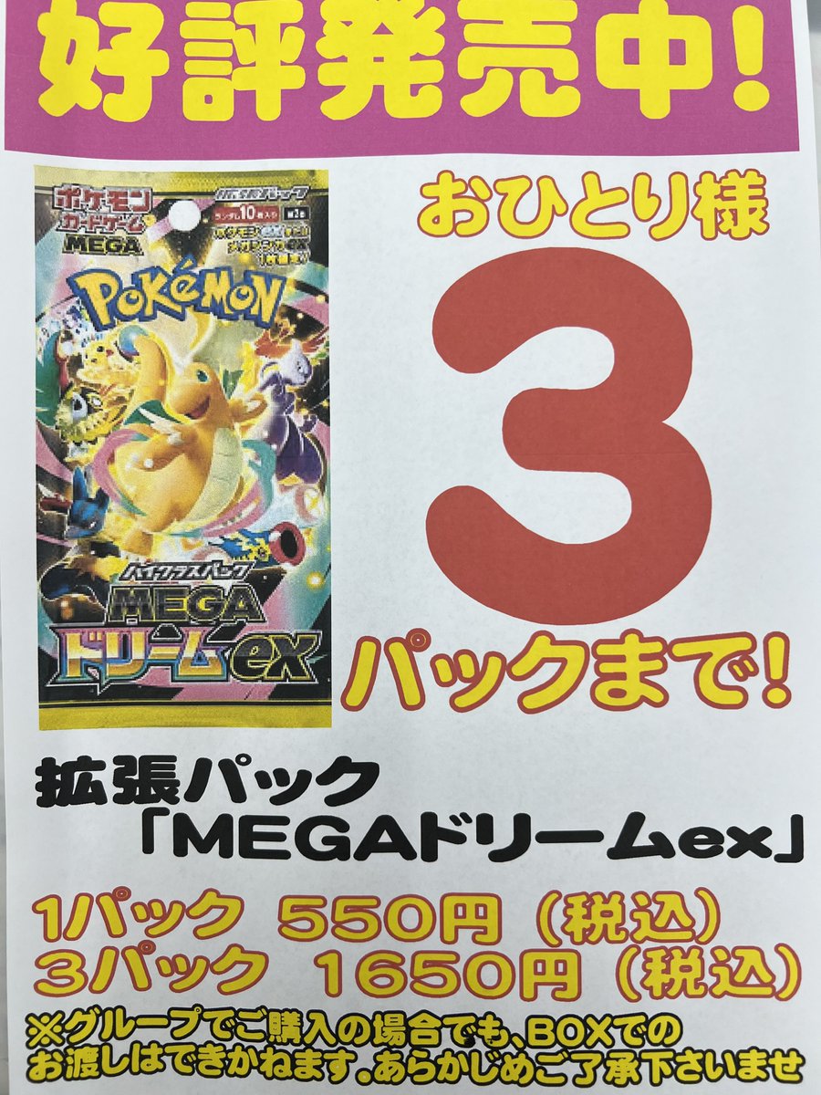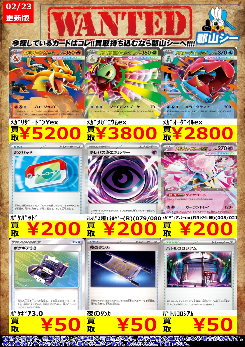 シーガル郡山店ポケカ数量限定お買取り情報更新です!よろしくお願いいたします! ※商品の状態や在庫状況により減額の可能性があり、表示価格の適用外となる場合がございます。 オーガポンみどりのめんex(114/101 SR) ¥400 ゼクロムex(161/086 SR) ¥500 Nの筋書き(165/086 SR) ¥500