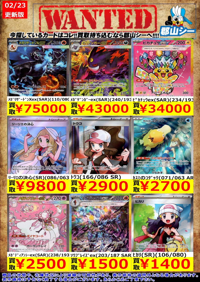 シーガル郡山店ポケカ数量限定お買取り情報更新です!よろしくお願いいたします! ※商品の状態や在庫状況により減額の可能性があり、表示価格の適用外となる場合がございます。 メガヤミラミ&バンギラスGX(102/094 SR)[SA] ¥25,000 メイ(067/049 SR) ¥52,000