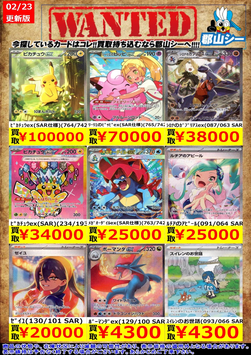 シーガル郡山店ポケカ数量限定お買取り情報更新です!よろしくお願いいたします! ※商品の状態や在庫状況により減額の可能性があり、表示価格の適用外となる場合がございます。 ピカチュウex(SAR)(234/193) ¥34,000 カキツバタ(090/064 SAR) ¥500 モモワロウex(219/187 SAR) ¥500