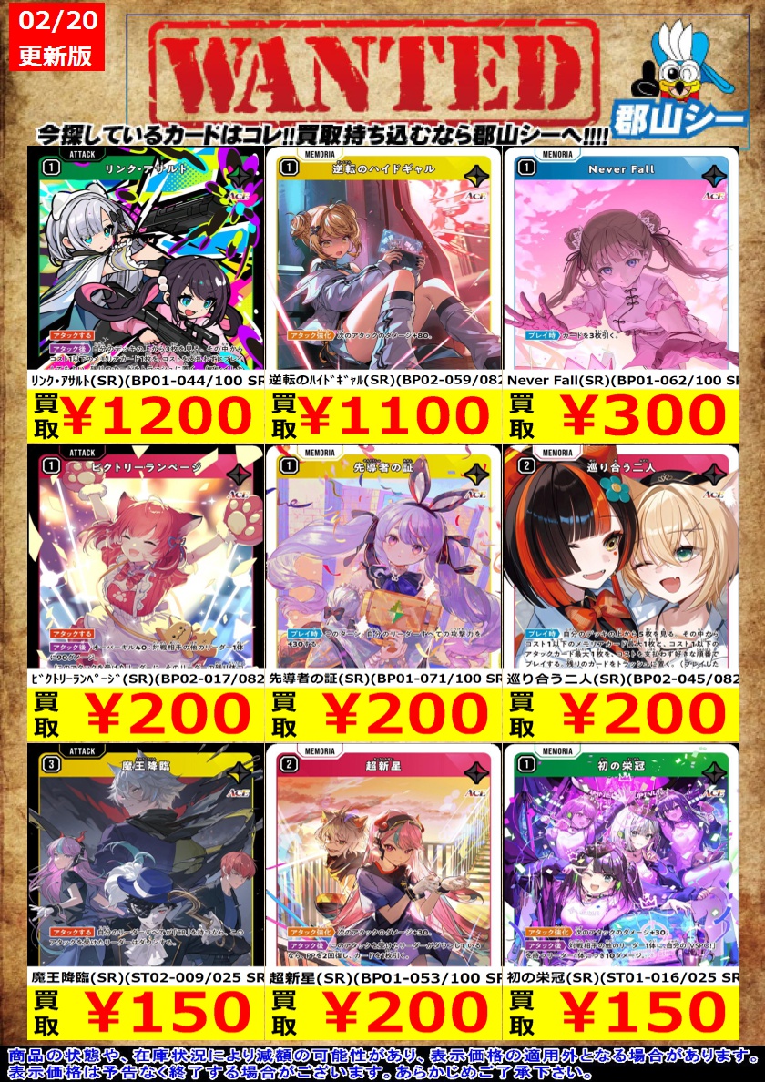 シーガル郡山店クロスタお買取情報!! 勝利の雄たけび(SR)(BP02-031/082) ¥30 オールスターコンボ(SR)(BP02-038/082) ¥30 先導者の証(SR)(BP01-071/100 SR) ¥200