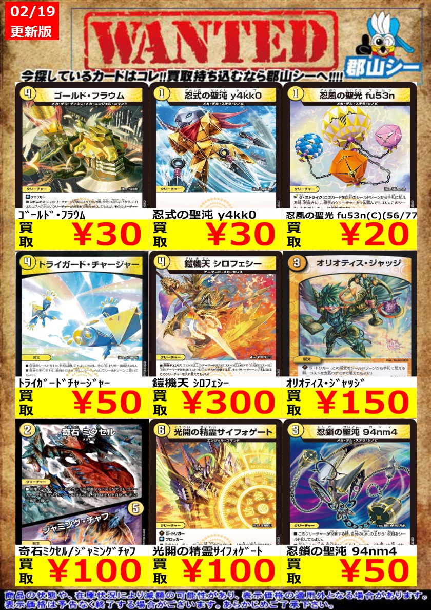 シーガル郡山店デュエマノーマルお買取り情報!! ※商品の状態や在庫状況により減額の可能性があり、表示価格の適用外となる場合がございます。 忍風の聖光 fu53n(C)(56/77) ¥20 忍式の聖沌 y4kk0 ¥30 ゴールド・フラウム ¥30