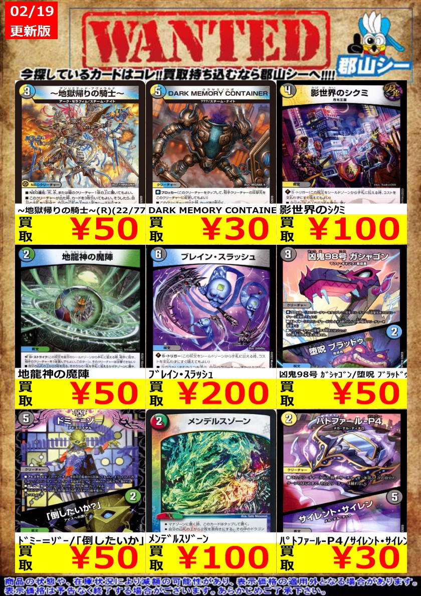 シーガル郡山店デュエマノーマルお買取り情報!! ※商品の状態や在庫状況により減額の可能性があり、表示価格の適用外となる場合がございます。 パトファール-P4/サイレント・サイレン ¥30 DARK MEMORY CONTAINER ¥30 地龍神の魔陣 ¥50