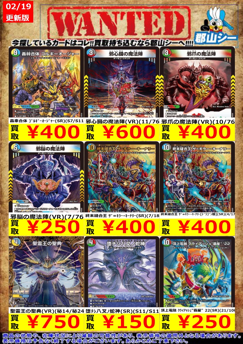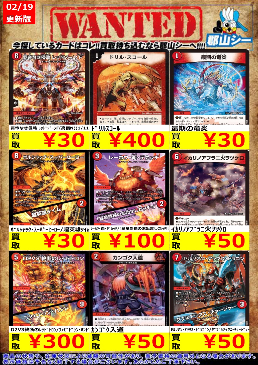 シーガル郡山店デュエマノーマルお買取り情報!! ※商品の状態や在庫状況により減額の可能性があり、表示価格の適用外となる場合がございます。 ボルシャック・スーパーヒーロー/超英雄タイム ¥30 斬斬人形コダマンマ GS ¥30 最期の竜炎 ¥30