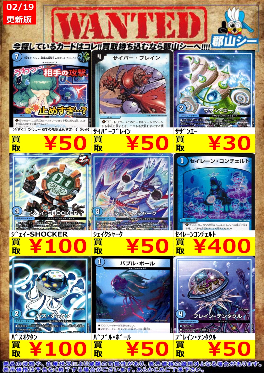 シーガル郡山店デュエマノーマルお買取り情報!! ※商品の状態や在庫状況により減額の可能性があり、表示価格の適用外となる場合がございます。 トレジャーマップ ¥30 闘争類拳嘩目ステゴロカイザー/お清めシャラップ ¥30 タイク・タイソンズ ¥50