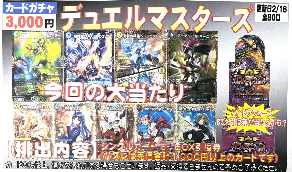 🌈デュエマ3000円自販機くじ🌈 内容見直しと更新を行いました‼️ パンドラウォーズBOX引換券や豪華CSプロモ・金トレジャーなどが当たっちゃいます✨ 是非ぜひお試しください(*´ω`*)
