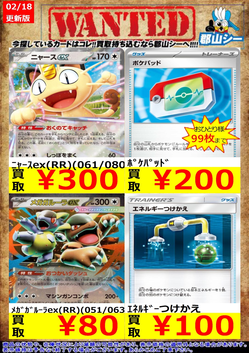 シーガル郡山店ポケカ数量限定お買取り情報更新です!よろしくお願いいたします! ※商品の状態や在庫状況により減額の可能性があり、表示価格の適用外となる場合がございます。 ポケパッド ¥200 ニャースex(RR)(061/080) ¥300 ボスの指令 ゲーチス ¥30