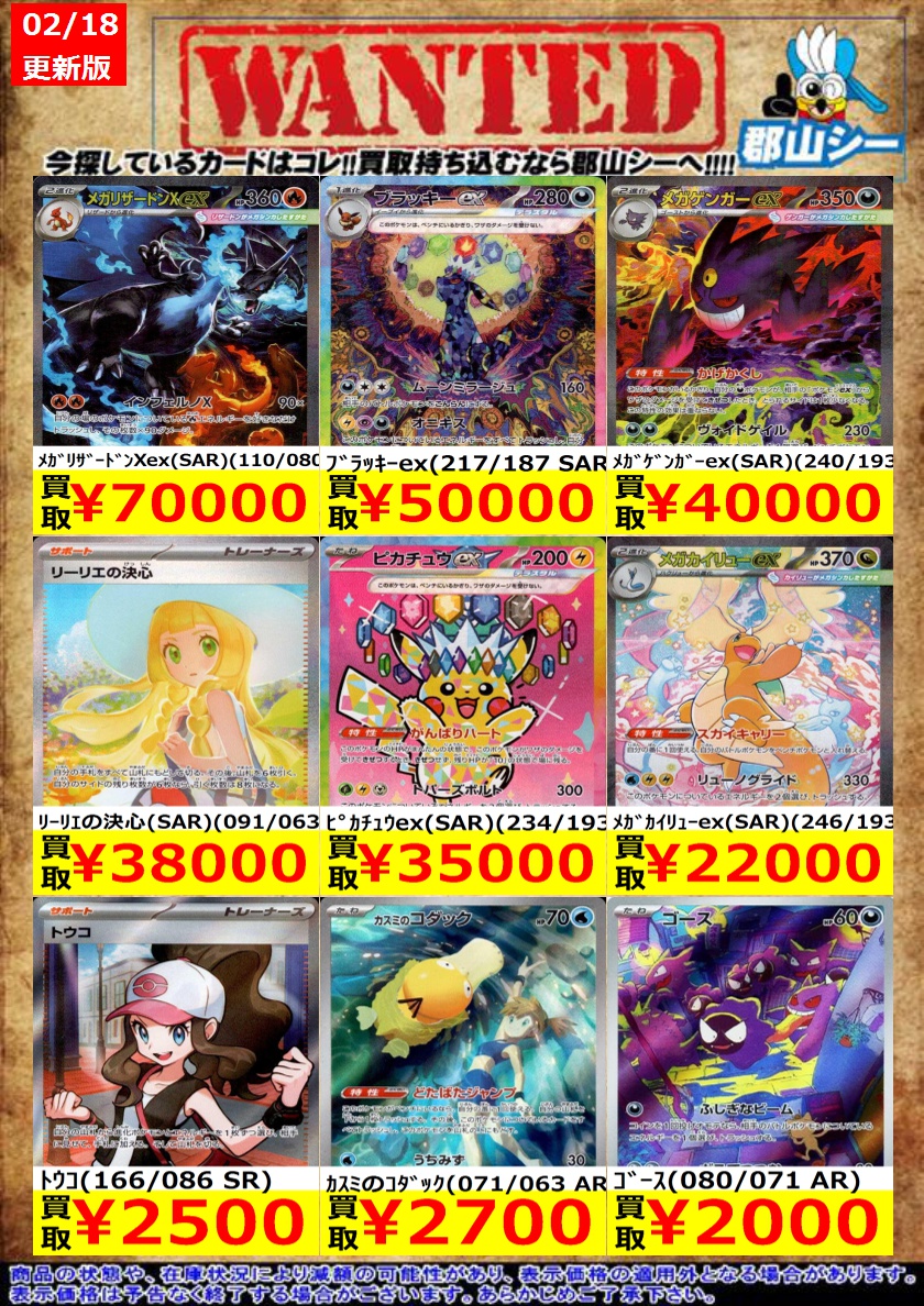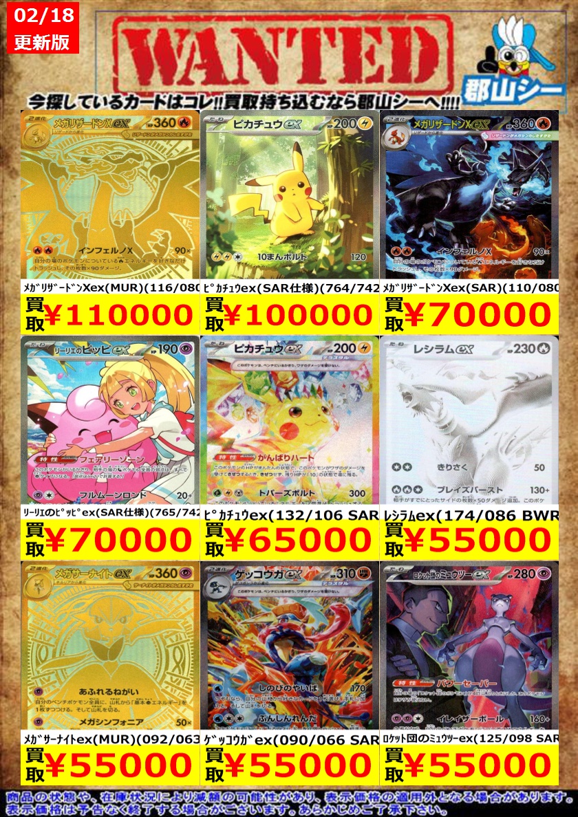 シーガル郡山店ポケカ数量限定お買取り情報更新です!よろしくお願いいたします! ※商品の状態や在庫状況により減額の可能性があり、表示価格の適用外となる場合がございます。 メガリザードンXex(SAR)(110/080) ¥70,000 ゼイユ(130/101 SAR) ¥20,000