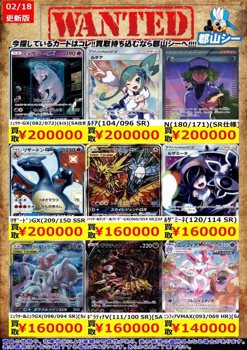 シーガル郡山店ポケカ数量限定お買取り情報更新です!よろしくお願いいたします! ※商品の状態や在庫状況により減額の可能性があり、表示価格の適用外となる場合がございます。 Nの筋書き(165/086 SR) ¥400 ジャッジマン(342/190 SR) ¥500 リーリエのピッピex(115/100 SR) ¥1,300