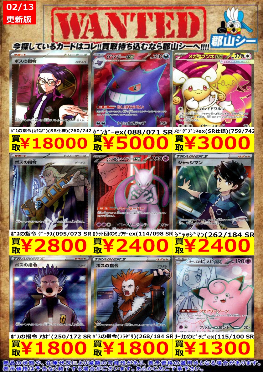 シーガル郡山店ポケカ数量限定お買取り情報更新です!よろしくお願いいたします! ※商品の状態や在庫状況により減額の可能性があり、表示価格の適用外となる場合がございます。 パンクメット(SR)(104/080) ¥300 イベルタルex(SR)(098/080) ¥400 ジャッジマン(342/190 SR) ¥500