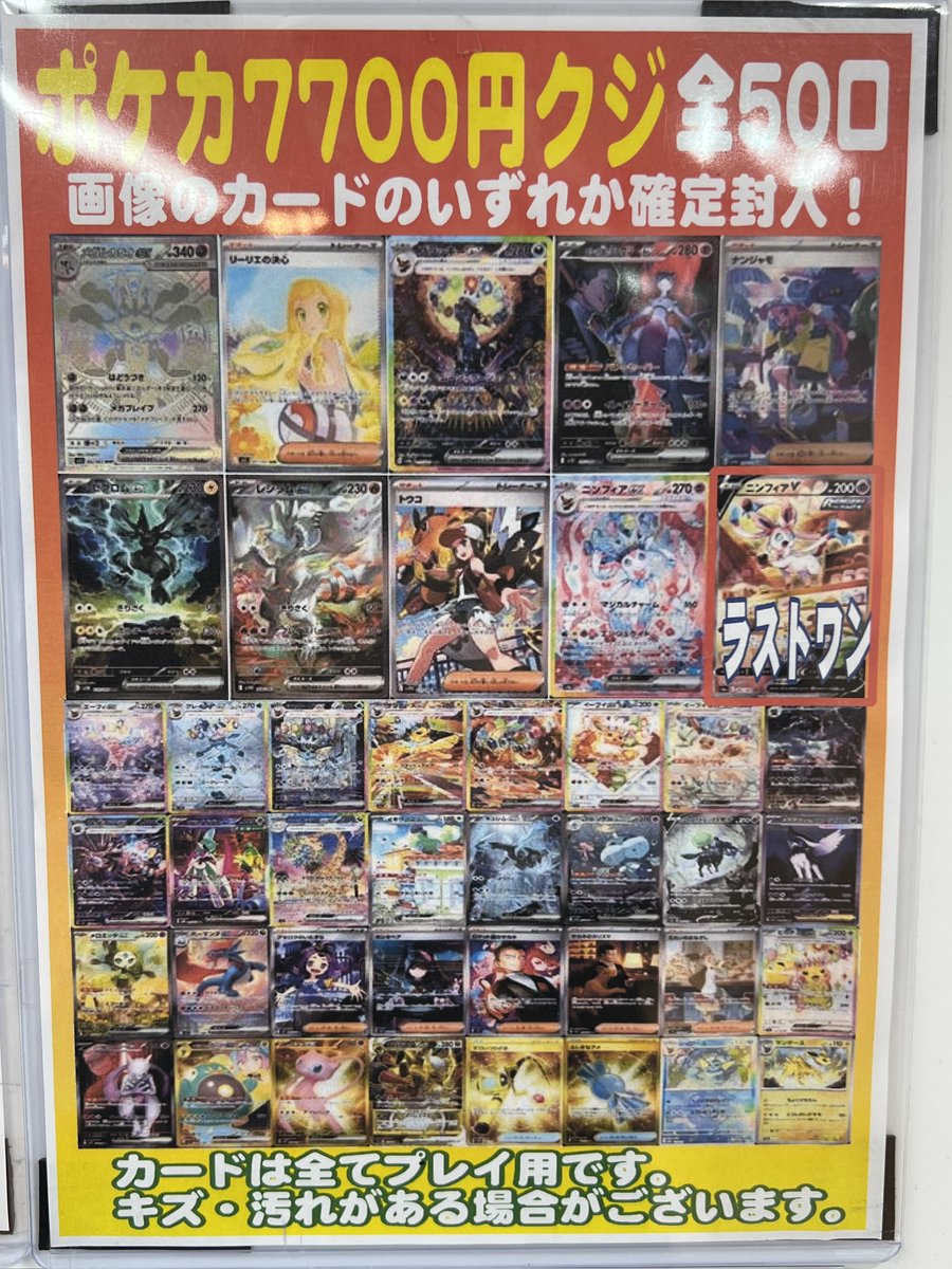 🌈ポケカ7,700円くじ🌈 全50口 新しく展開致しました‼️ 今回もメガルカリオexやリーリエの決心SAR等が当たります✨️ ラストワンはニンフィアVsa🩷 是非ぜひお試しください(*´ω`*)